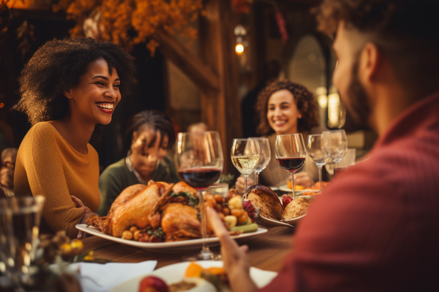 Friends enjoy a festive dinner with turkey and wine, creating a warm and joyful atmosphere. Perfect for holiday gatherings.
