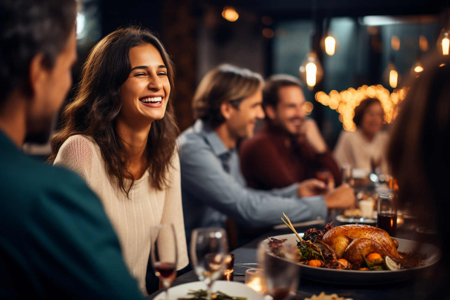 A joyful dinner gathering with friends, featuring a smiling woman and a delicious roasted turkey centerpiece.