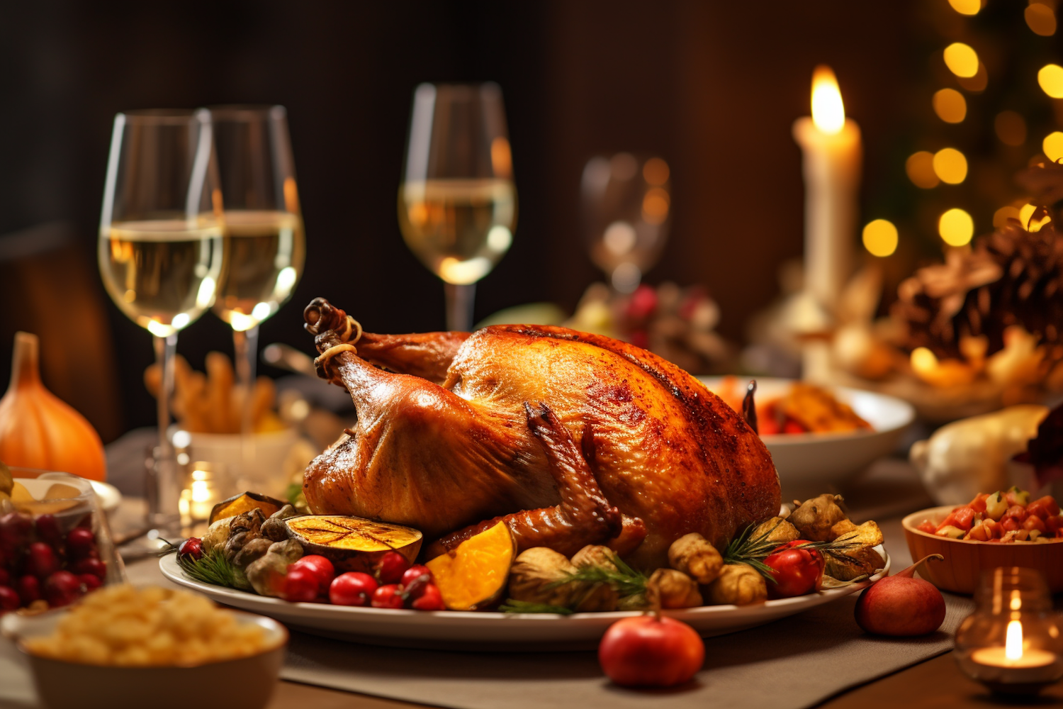 Festive dining table with a golden roasted turkey, garnished with cranberries and vegetables, accompanied by wine glasses and candlelight.