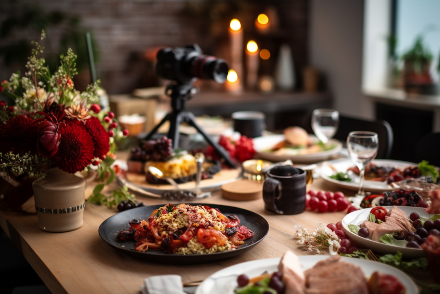 Elegant dining table with colorful dishes, a camera on a tripod, and warm candlelight ambiance.