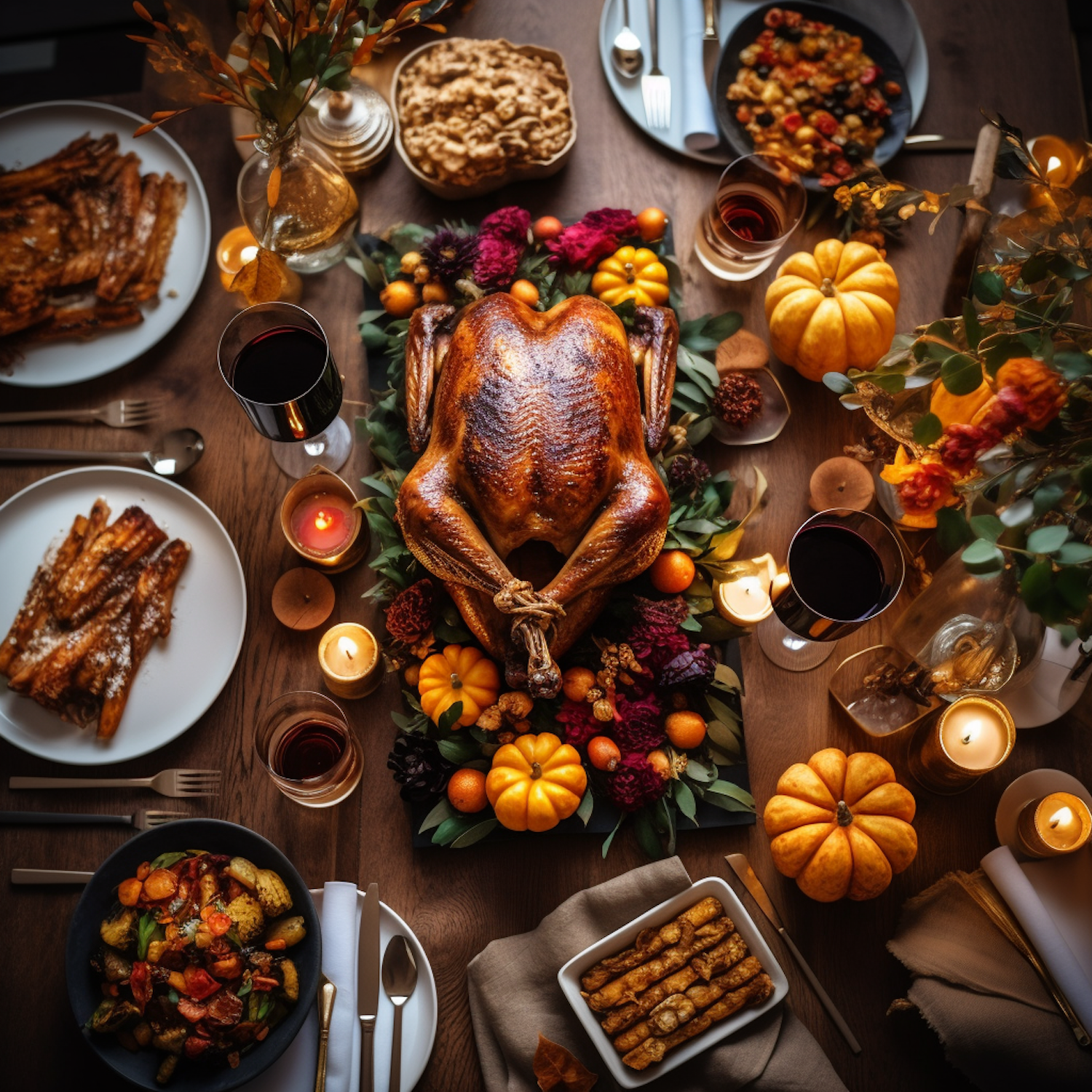 Thanksgiving table with a roasted turkey, side dishes, candles, and pumpkins, creating a warm and festive autumn ambiance.