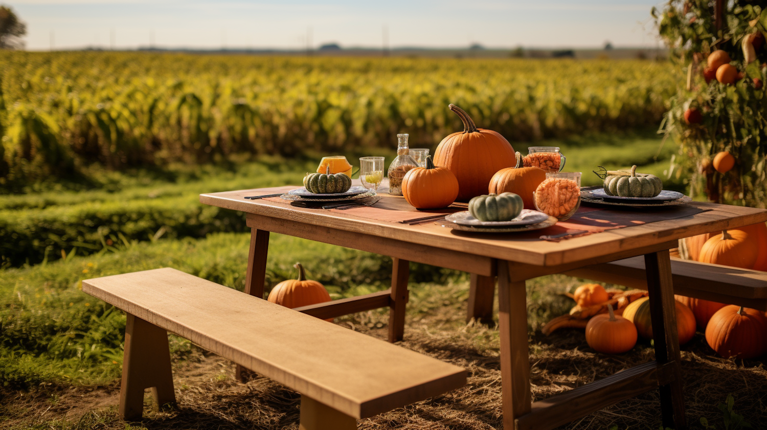 Rustic outdoor table set with pumpkins in a lush field, capturing the essence of autumn with warm sunlight and vibrant colors.