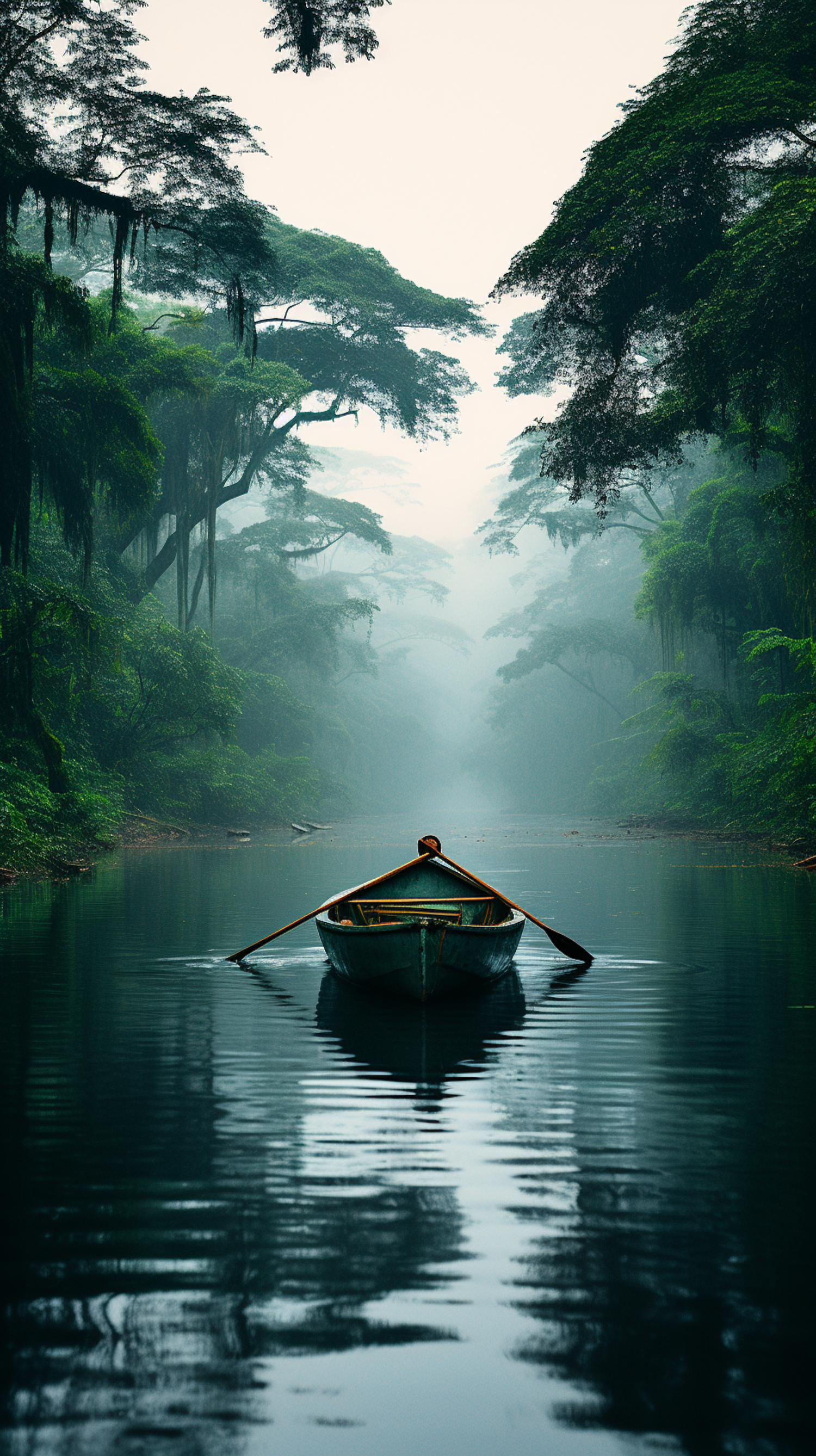 A tranquil boat floats on a misty river surrounded by lush green forest, creating a serene and mystical atmosphere.