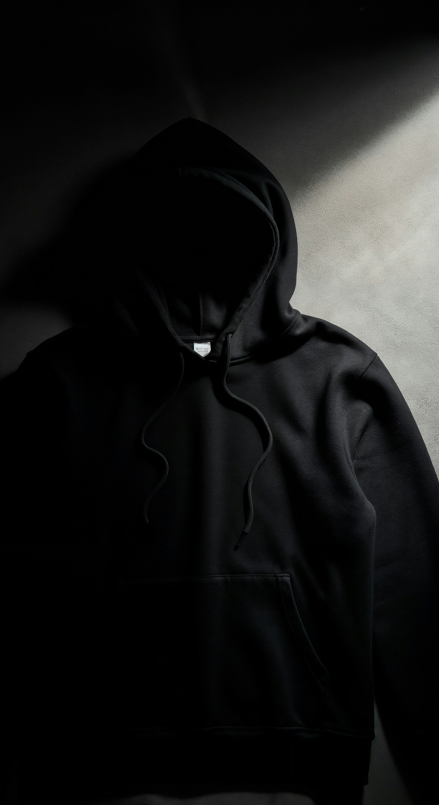 Moody black hoodie with dramatic lighting, featuring a soft texture and contrasting white tag. Perfect for fashion or streetwear themes.