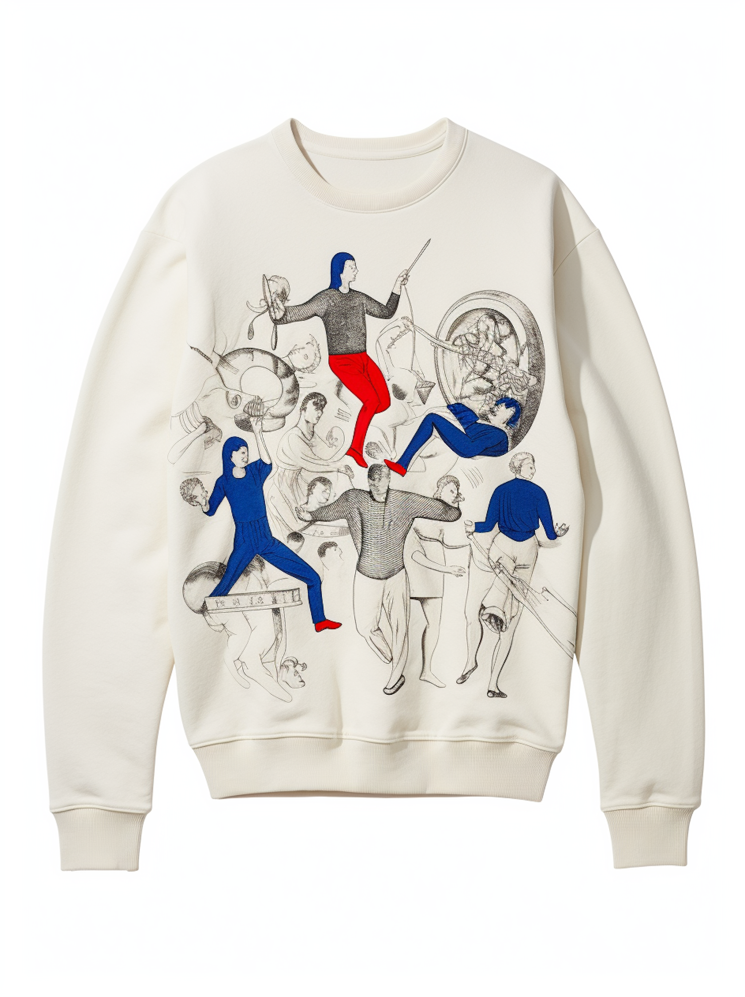 Cream sweatshirt with artistic design featuring colorful and monochrome figures in dynamic poses, blending modern and classic styles.