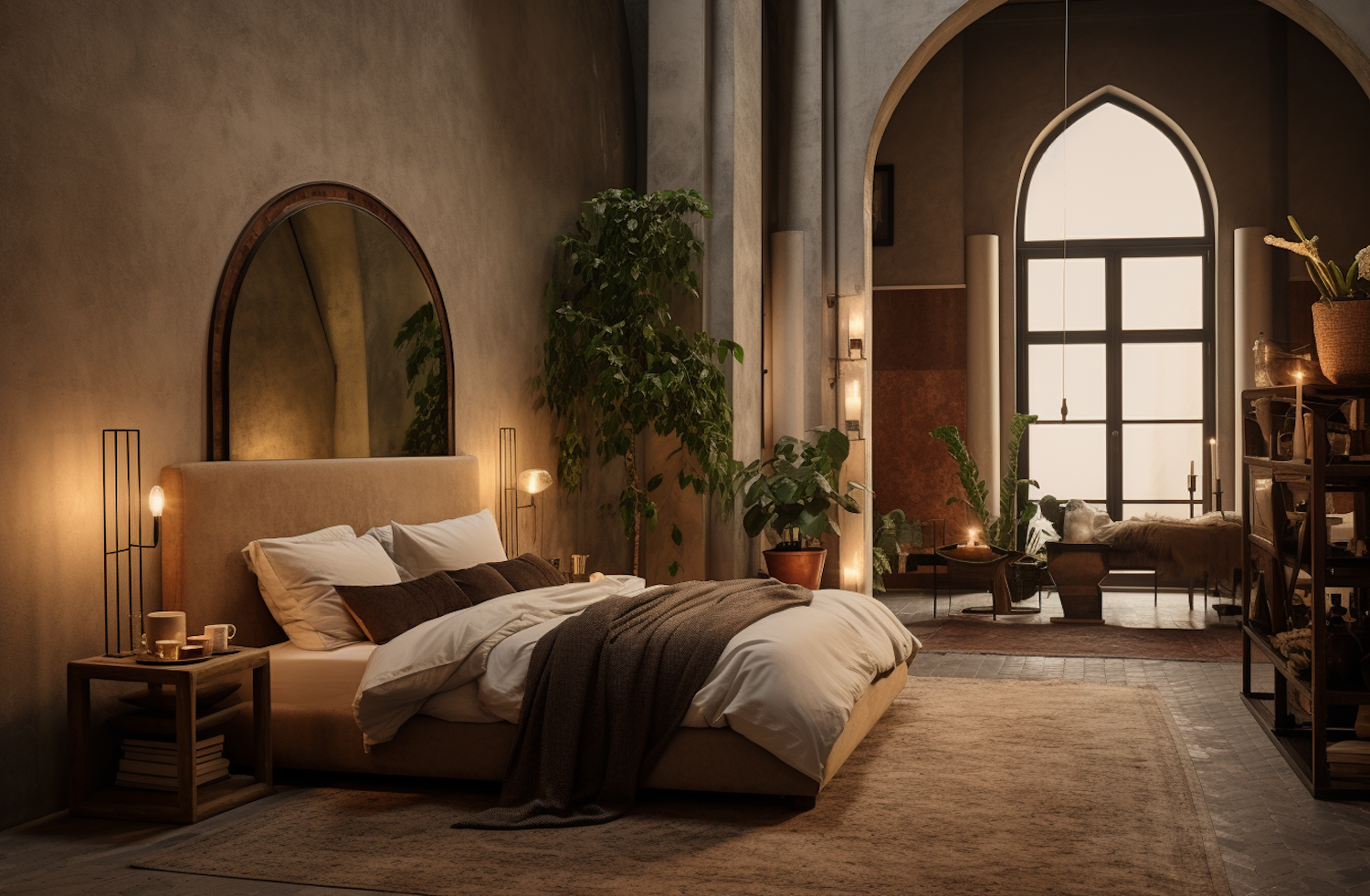 Cozy bedroom with warm lighting, lush plants, and a large arched window. Features a bed with white and brown bedding and a soft blanket.