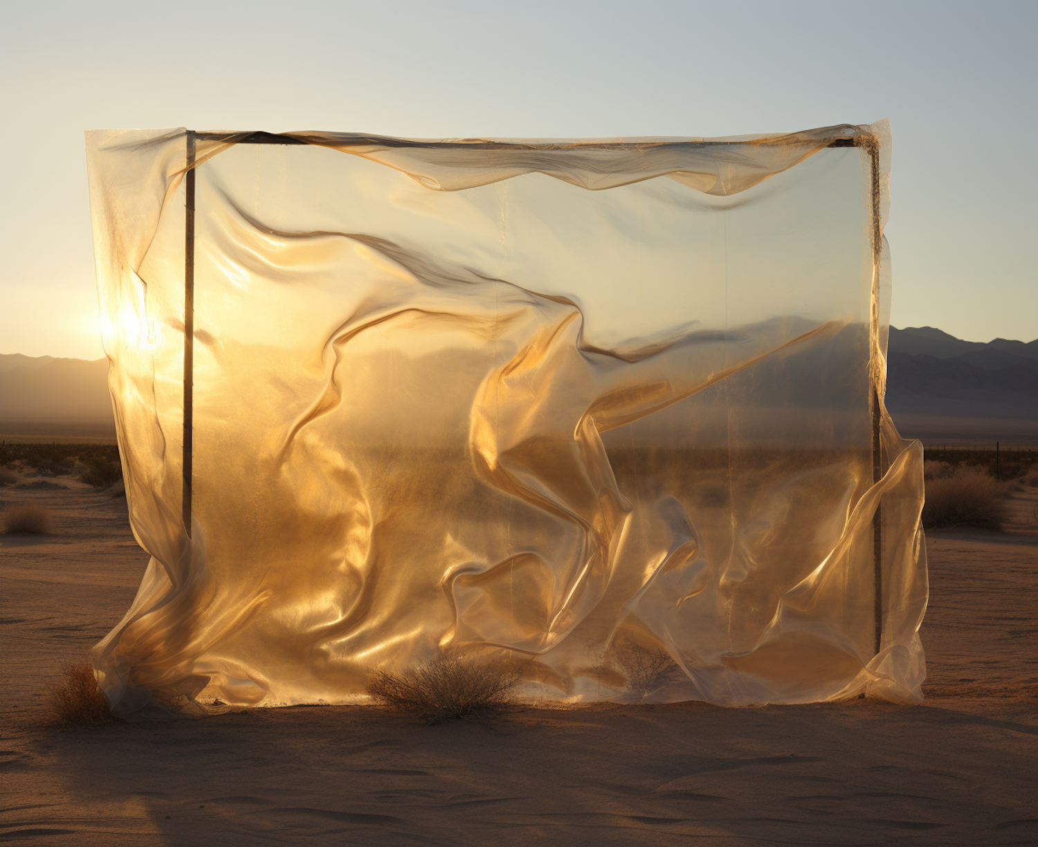 Transparent plastic sheet in desert, illuminated by sunset, creating a glowing, ethereal effect against a backdrop of mountains.