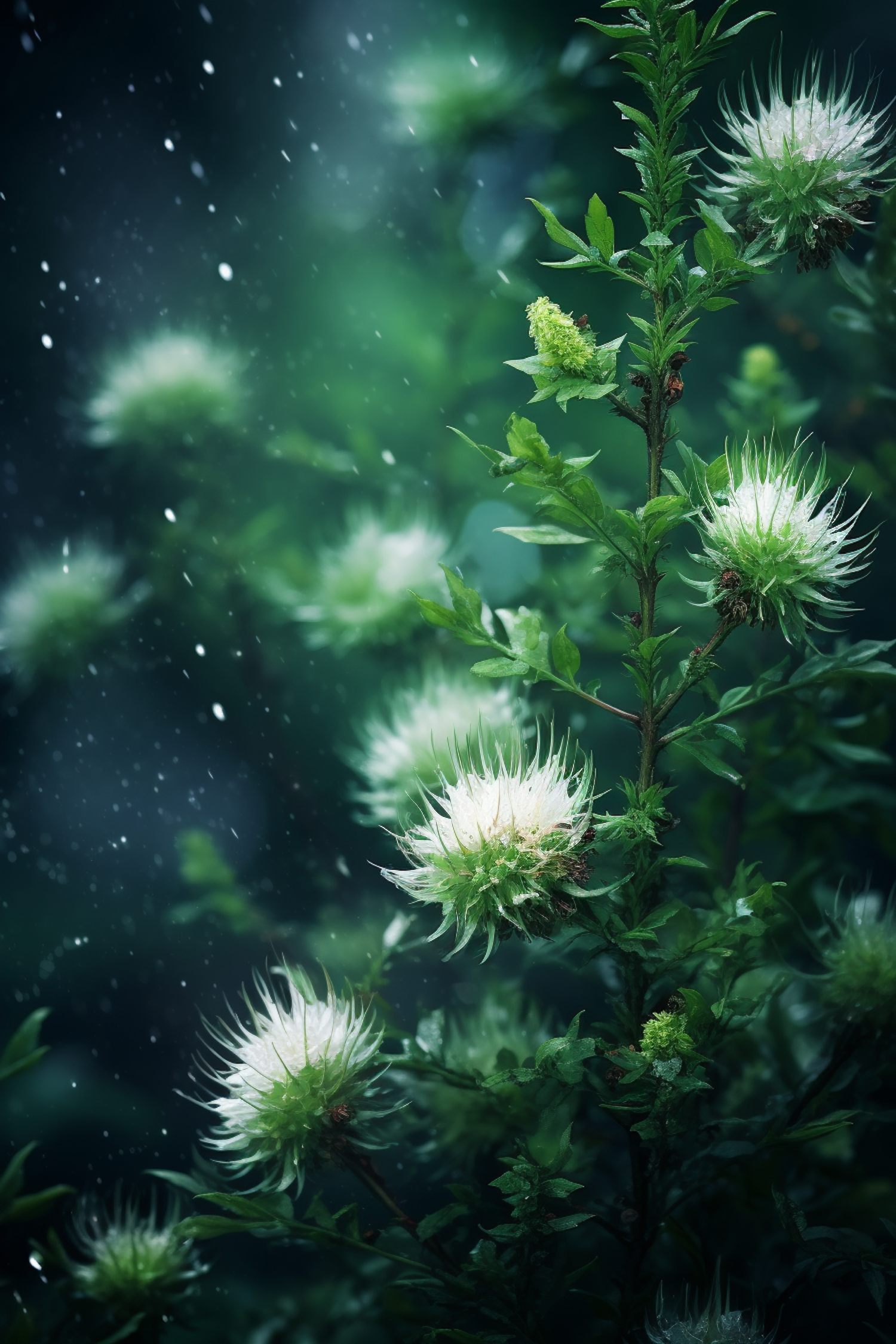 Lush green plant with spiky white flowers in a serene, rainy setting. Vibrant leaves and ethereal blooms create a dreamy atmosphere.
