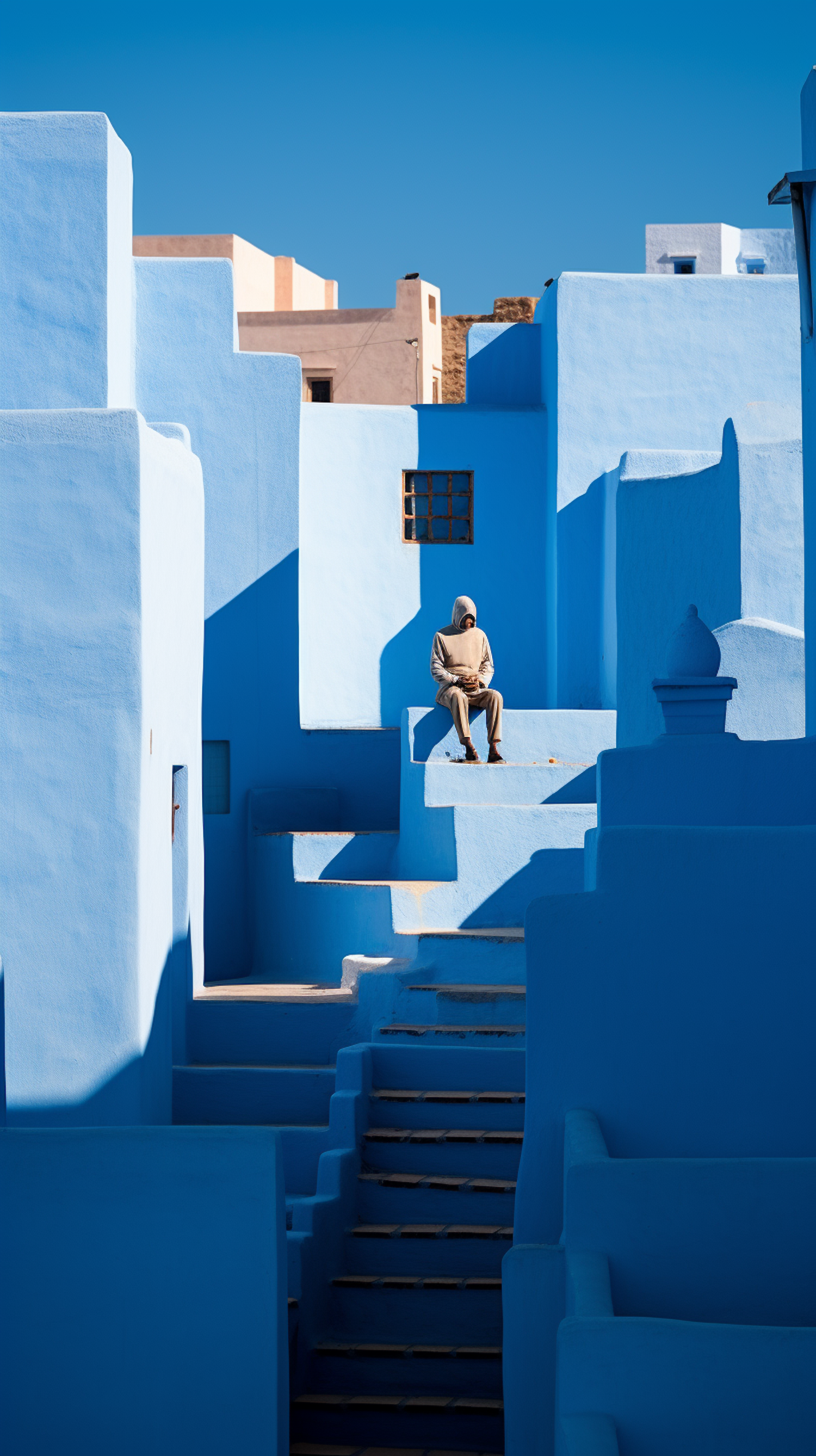 Person in hooded garment sits on blue steps, surrounded by vibrant blue architecture under a clear sky.