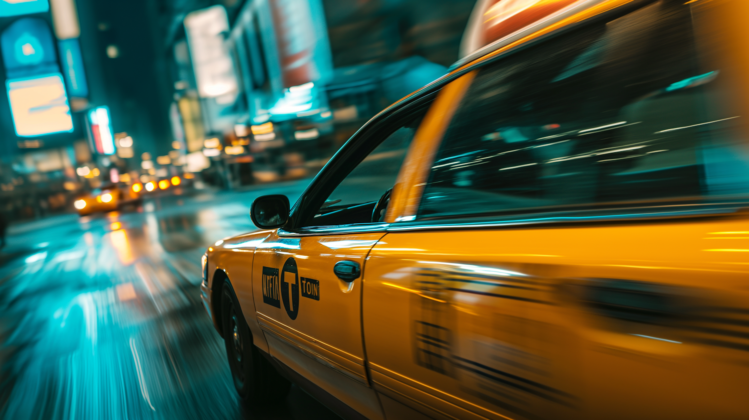 Dynamic shot of a yellow taxi speeding through a city at night, with motion blur and vibrant city lights.