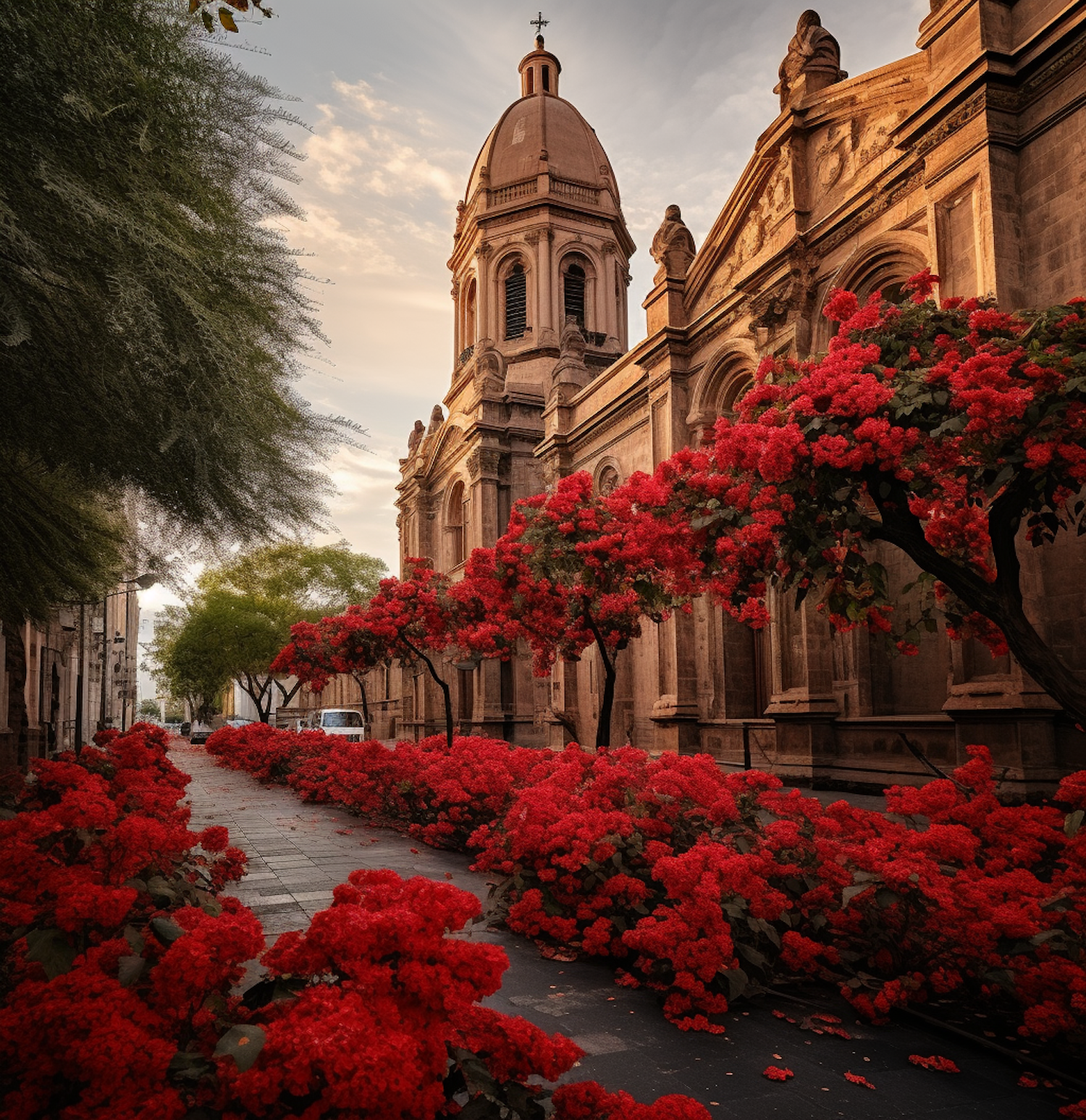 Historic building with a grand dome surrounded by vibrant red flowering trees, creating a stunning contrast in an urban setting.