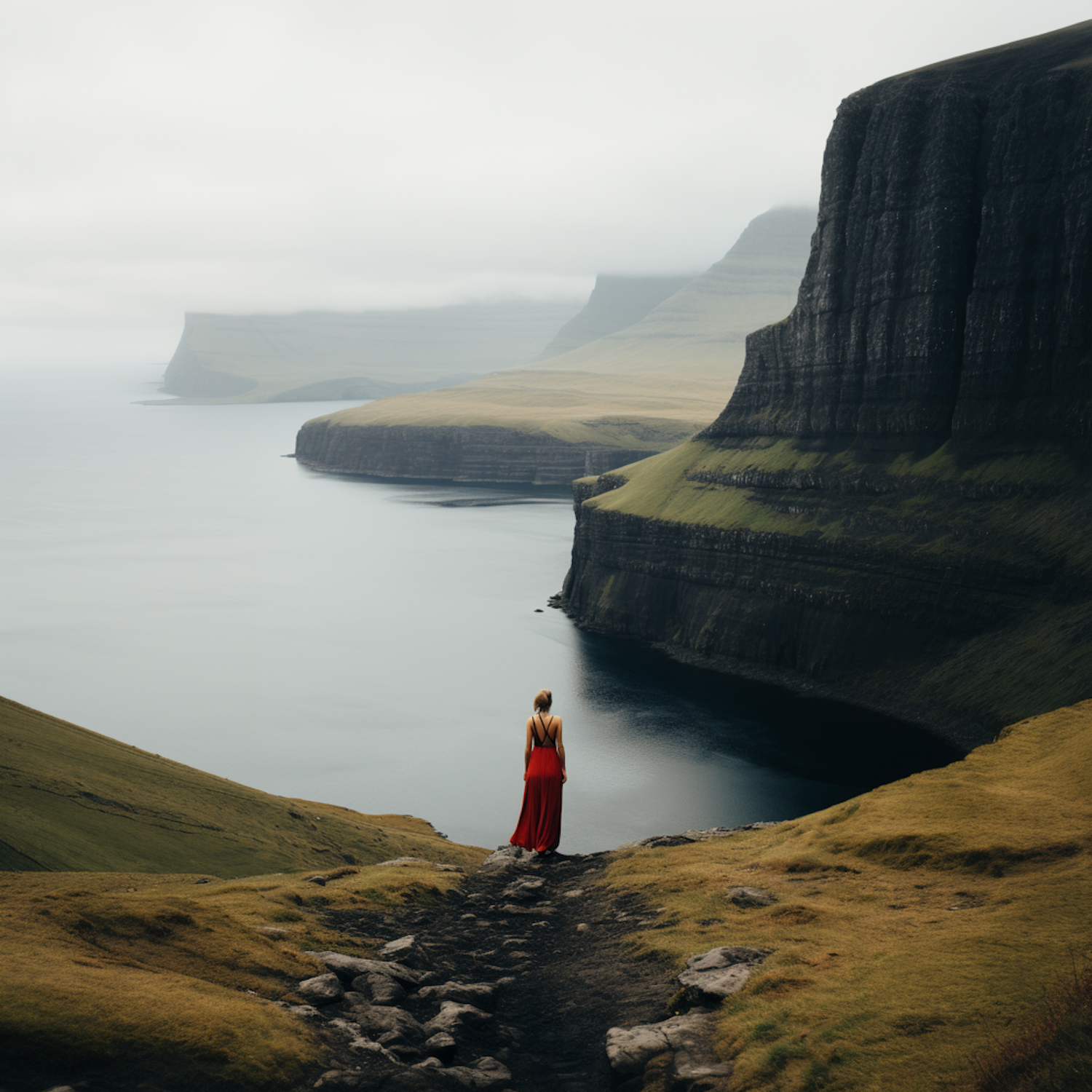 Woman in red dress stands on a cliff, overlooking misty coastal cliffs and calm waters, creating a serene and dramatic landscape.
