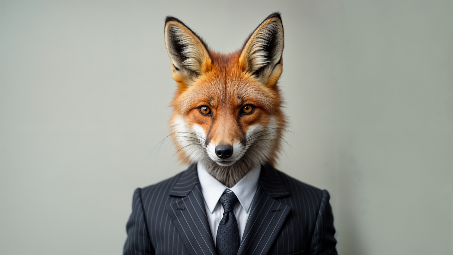 A fox with a human body in a pinstripe suit, blending nature and formality in a whimsical, surreal scene.