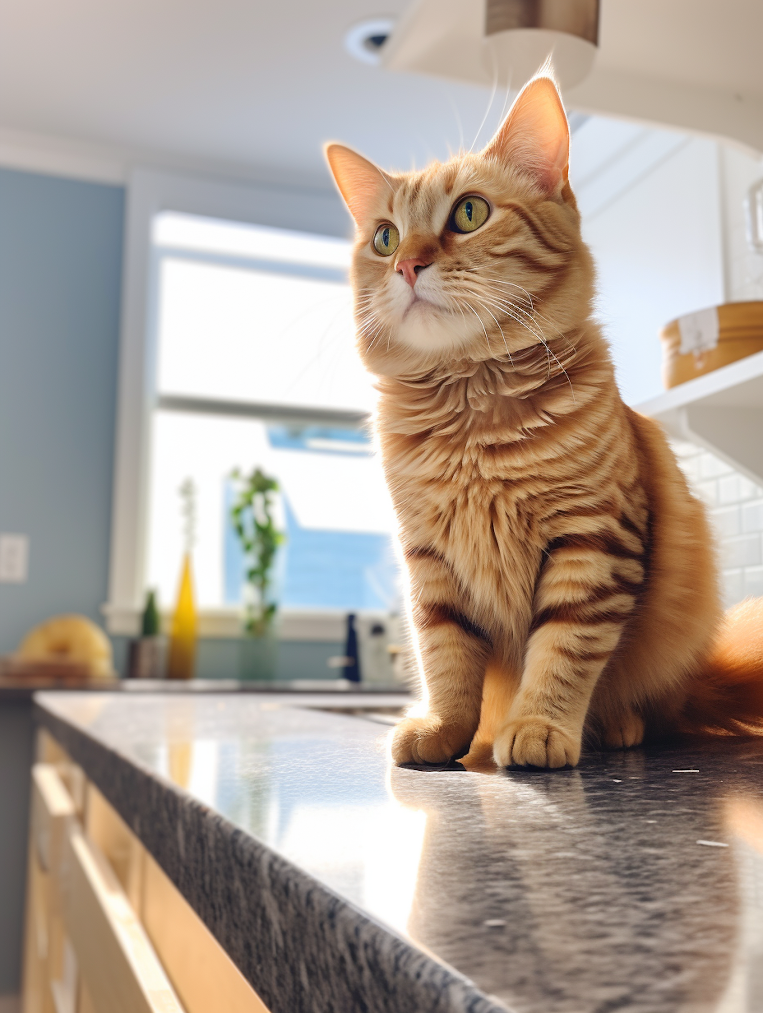 Ginger tabby cat with green eyes sits on a granite countertop in a sunlit kitchen, surrounded by cozy decor and warm lighting.