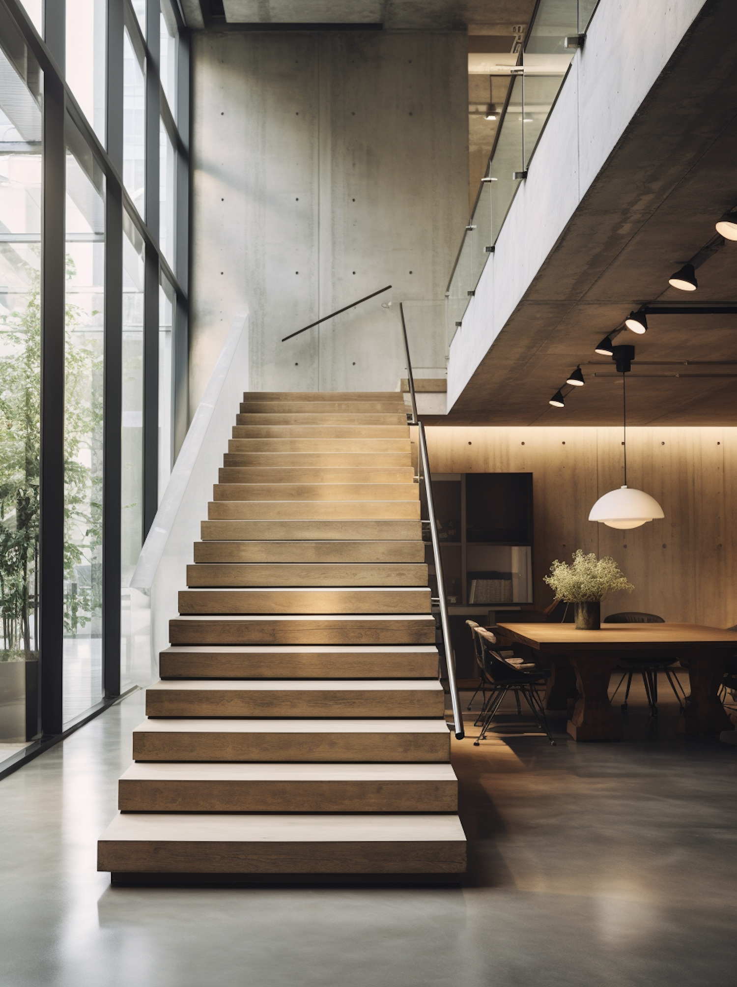 Modern interior with wooden staircase, concrete walls, and large windows. Dining area with wooden table and pendant lamp.