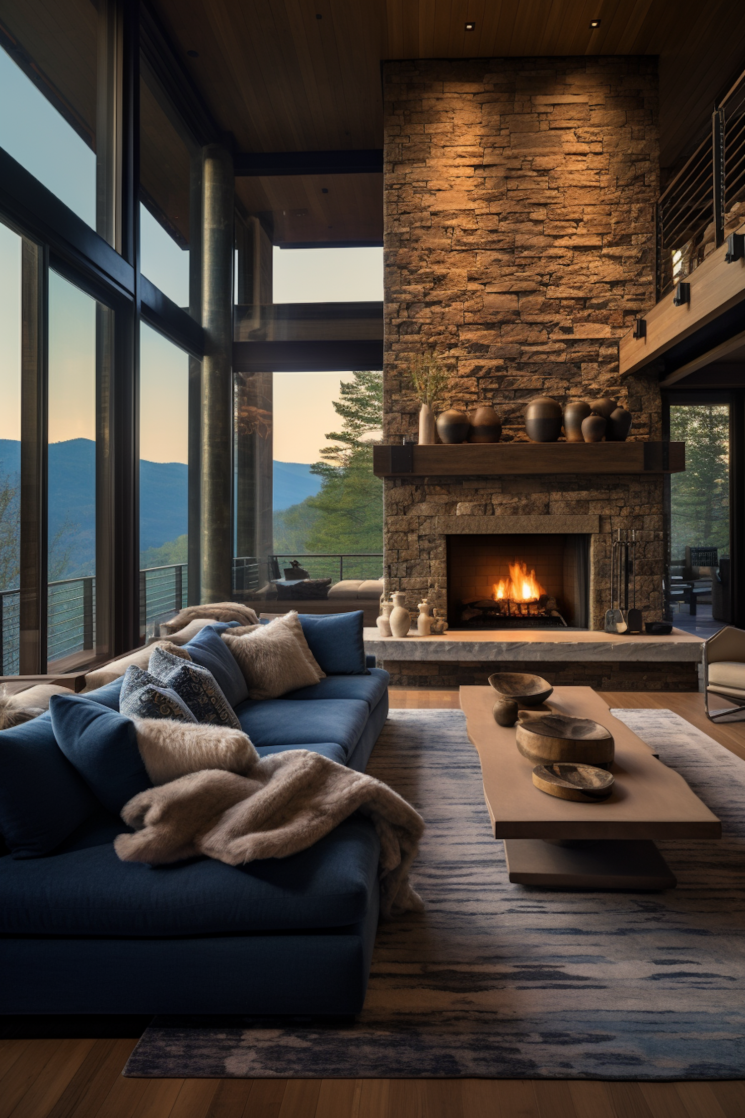 Luxurious living room with stone fireplace, blue sofa, and mountain views. Rustic elegance meets modern comfort.
