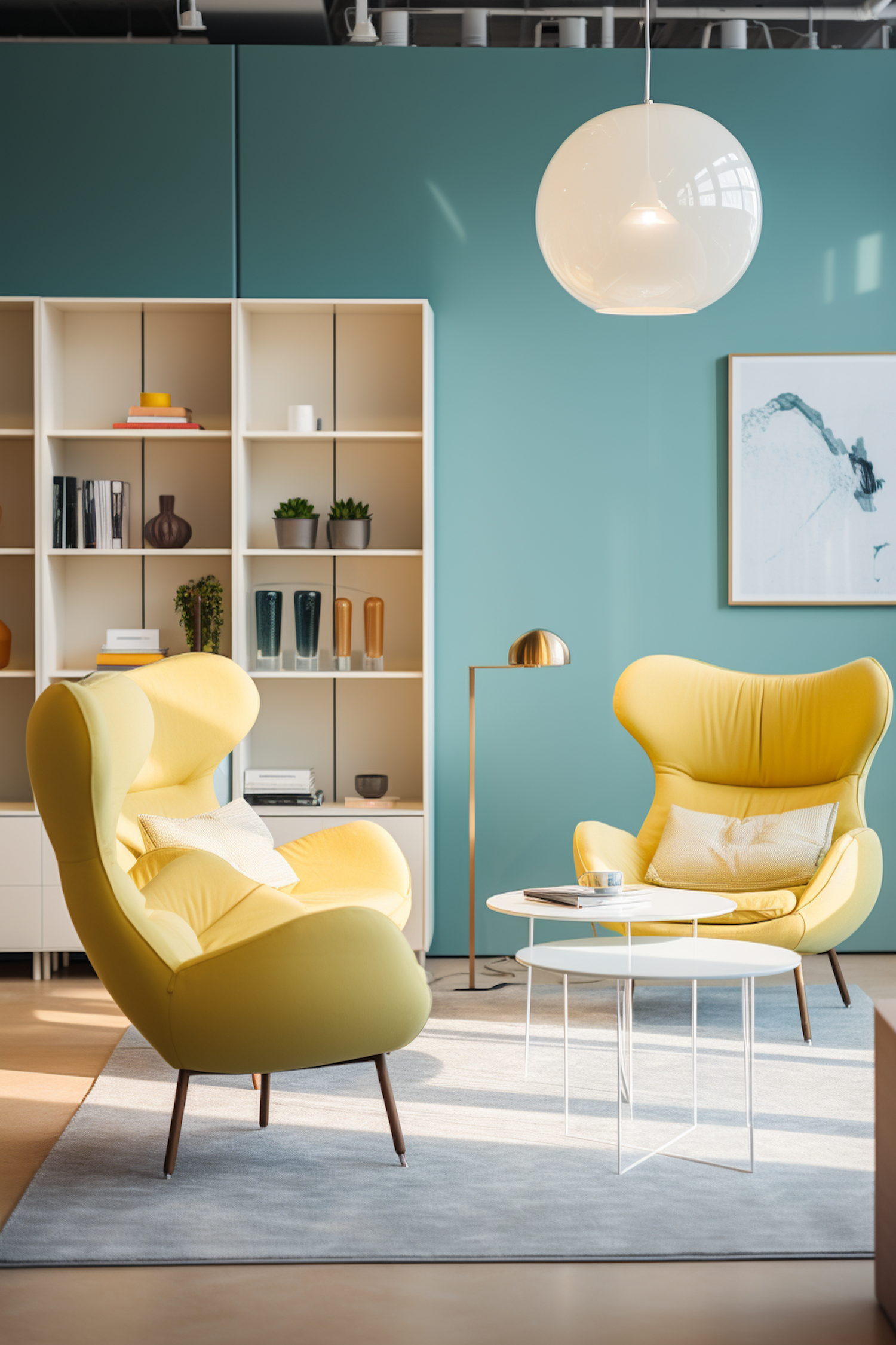 Modern living room with yellow armchairs, teal walls, and stylish decor. Features a pendant light and sleek shelving unit.
