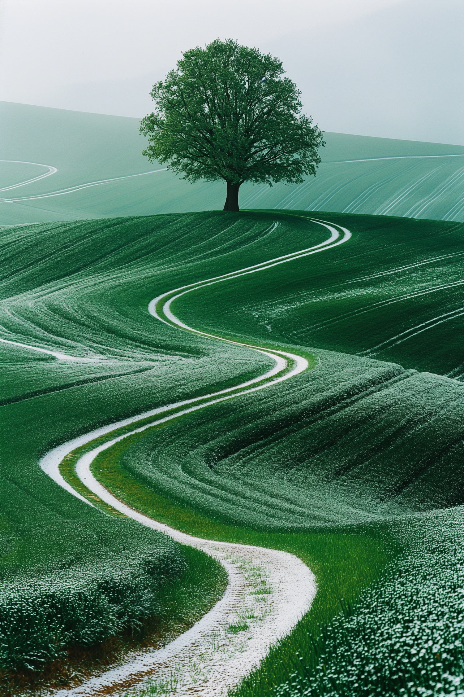 Majestic tree on rolling hills with a winding path, vibrant green fields, and serene sky. A harmonious blend of nature's beauty.