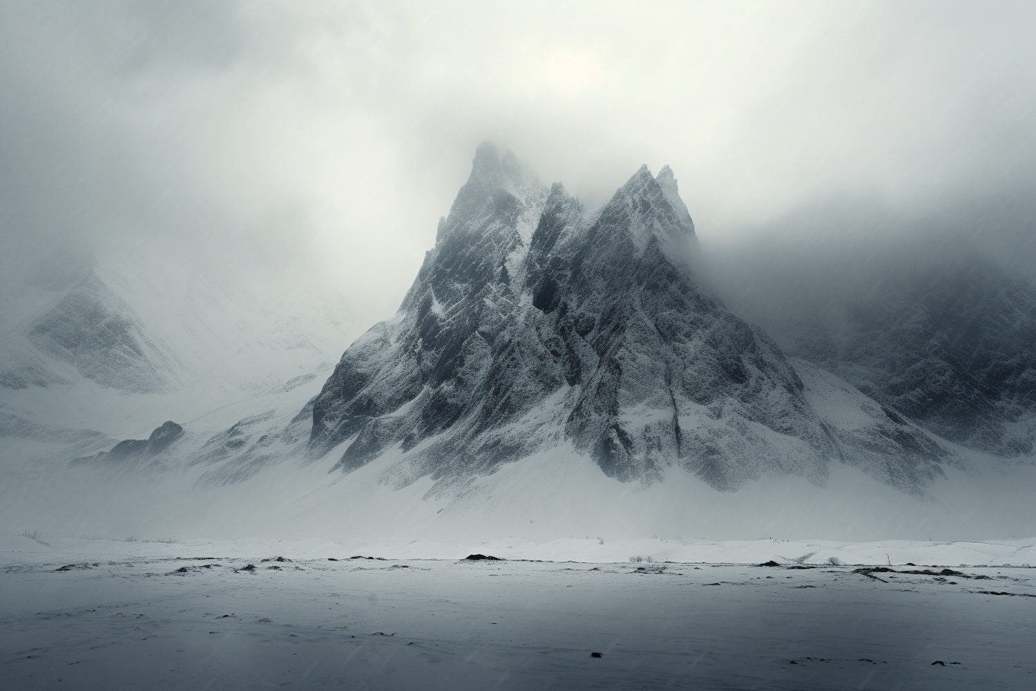 Majestic snow-covered mountains shrouded in mist, with rugged peaks and a serene, overcast sky.