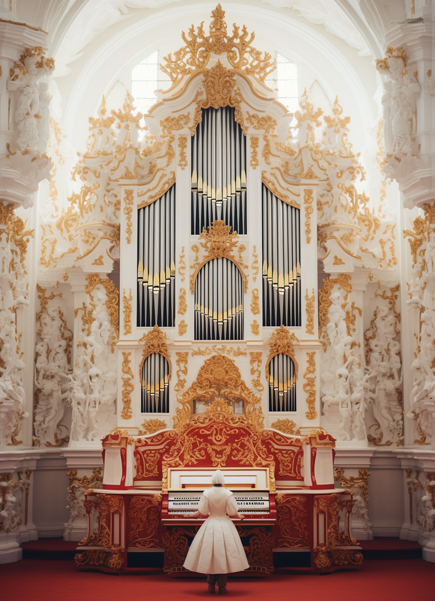 A person in a white coat stands before an ornate gold and white pipe organ in a grand church interior with red carpet.