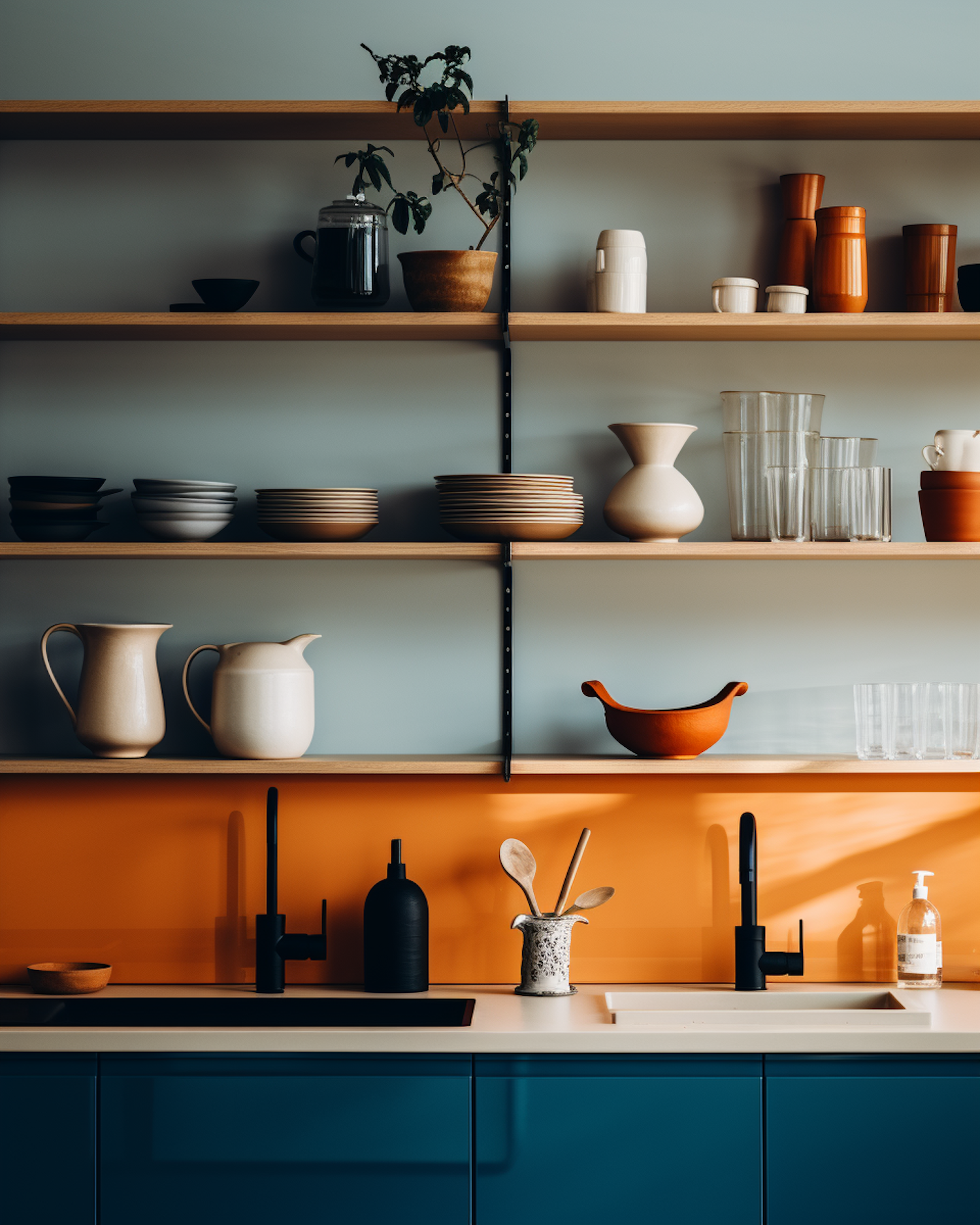 Modern kitchen with open shelves, teal cabinets, and orange backsplash. Stylish ceramics and glassware add elegance to the minimalist design.