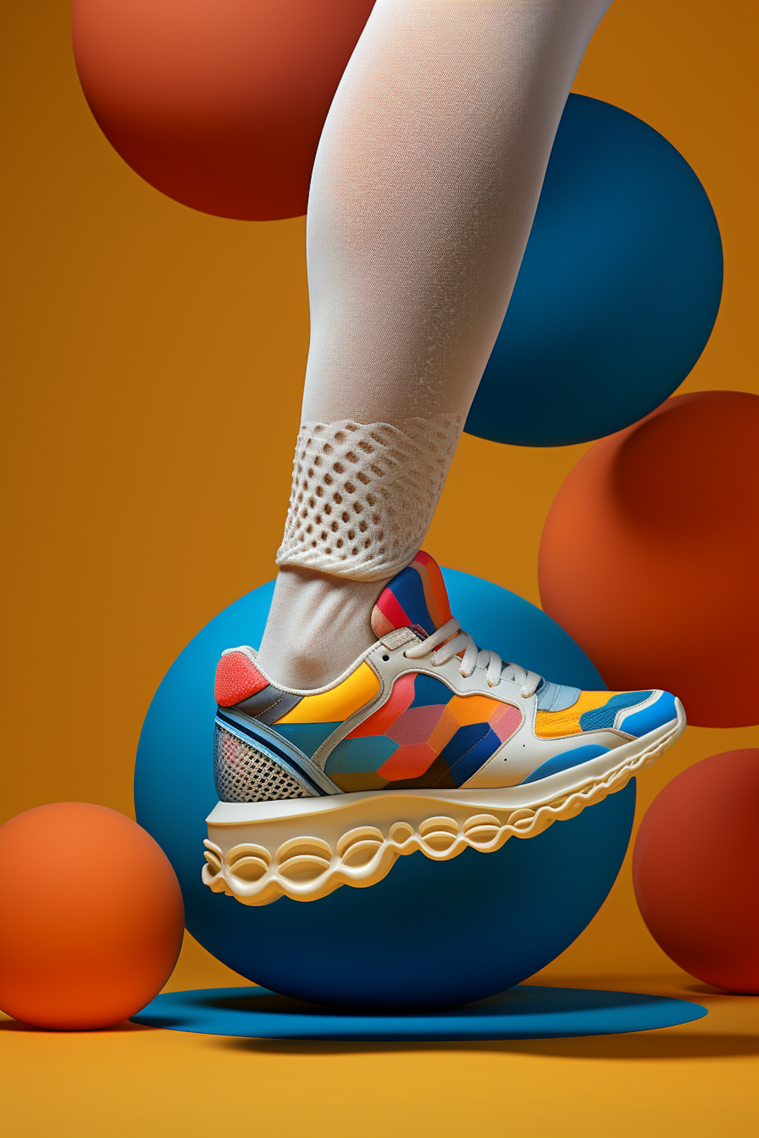 Colorful sneaker with geometric patterns and wavy sole, set against a vibrant background with blue and orange spheres.