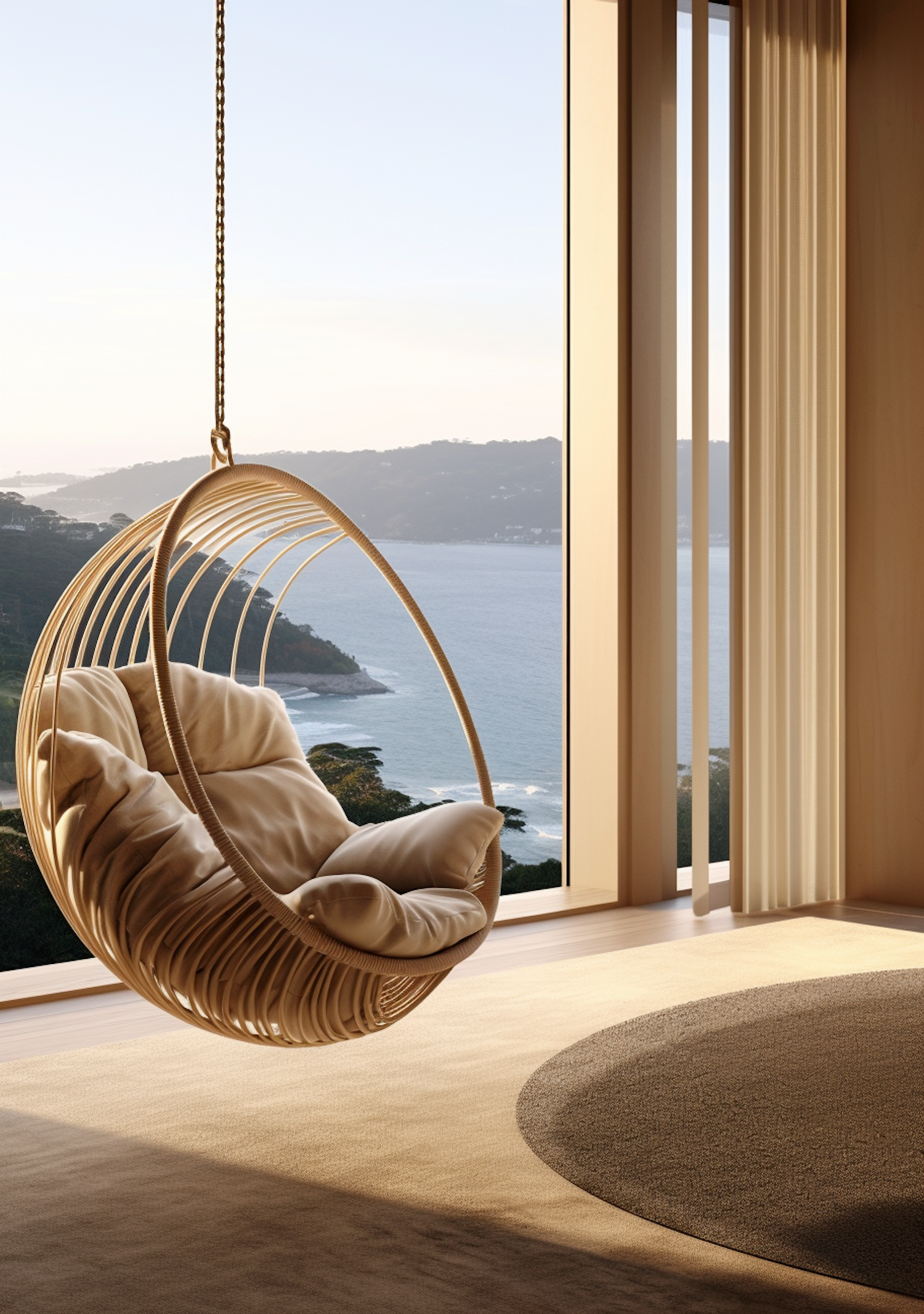 Cozy hanging rattan chair with plush cushions by a window overlooking a serene coastal view, bathed in warm natural light.