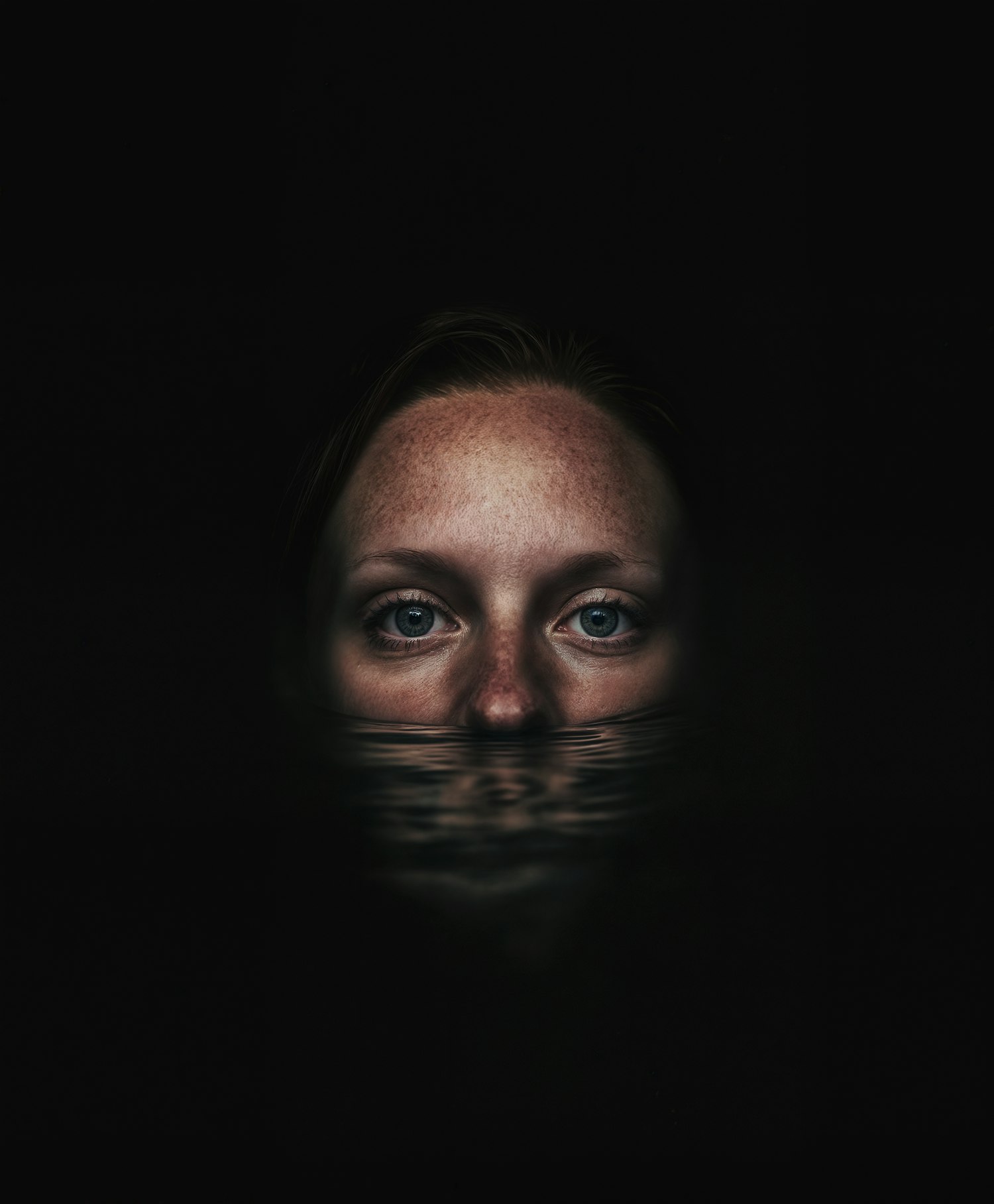 A captivating portrait of a freckled face with blue eyes partially submerged in water against a dark background.