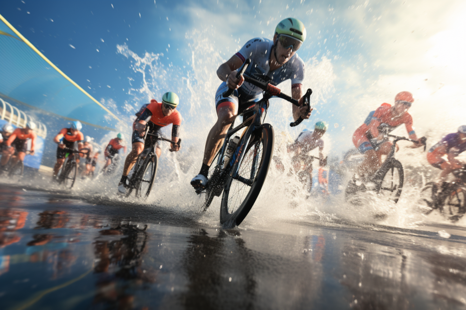 Cyclists race through water, creating dramatic splashes under a sunny sky, showcasing speed, determination, and dynamic motion.