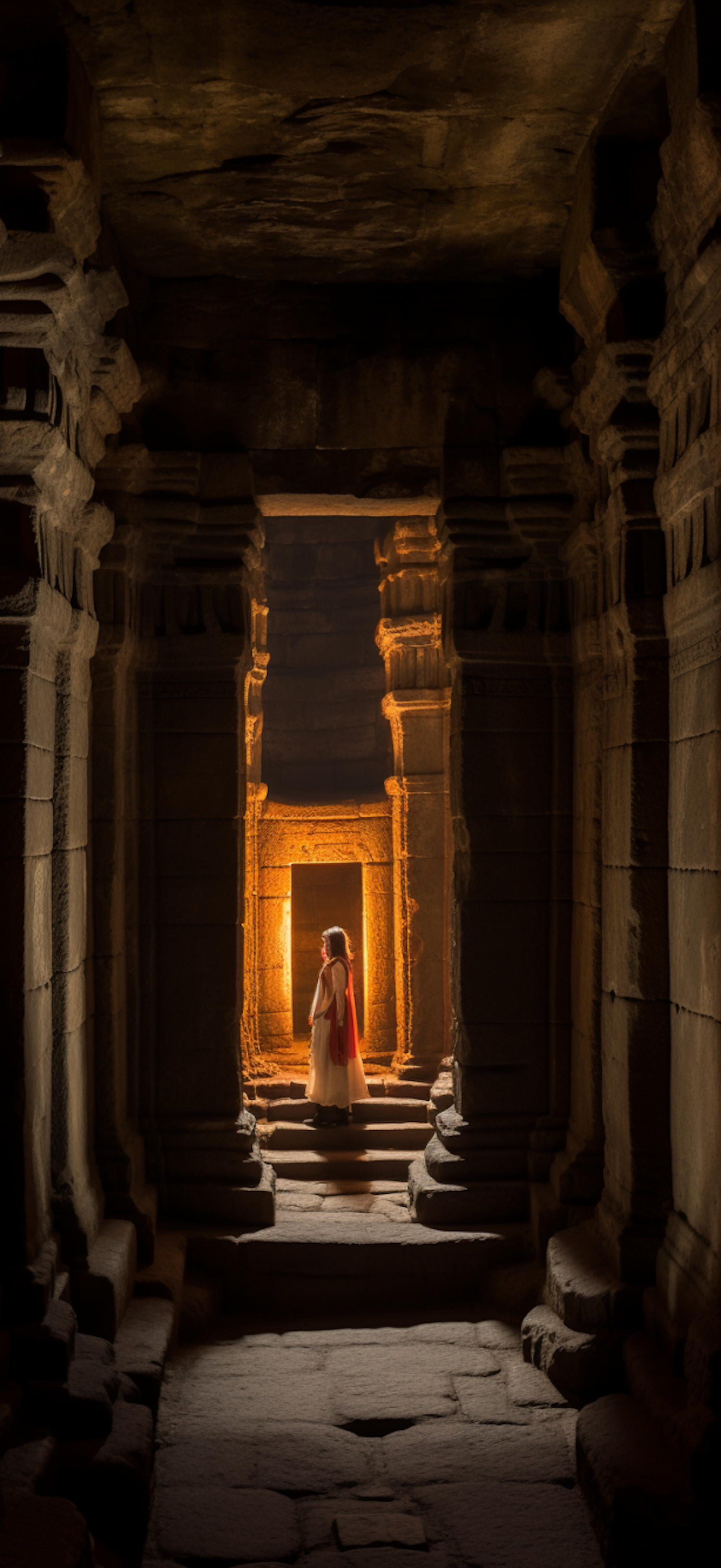 A person in a white robe and red shawl stands in a dimly lit ancient stone corridor, facing a glowing doorway.