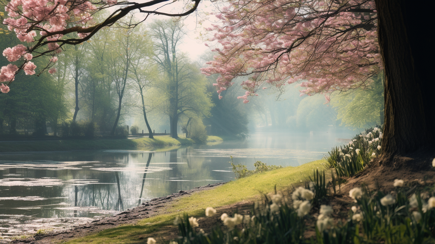 Tranquil riverside with cherry blossoms and lush greenery, reflecting in calm waters under soft, gentle light.