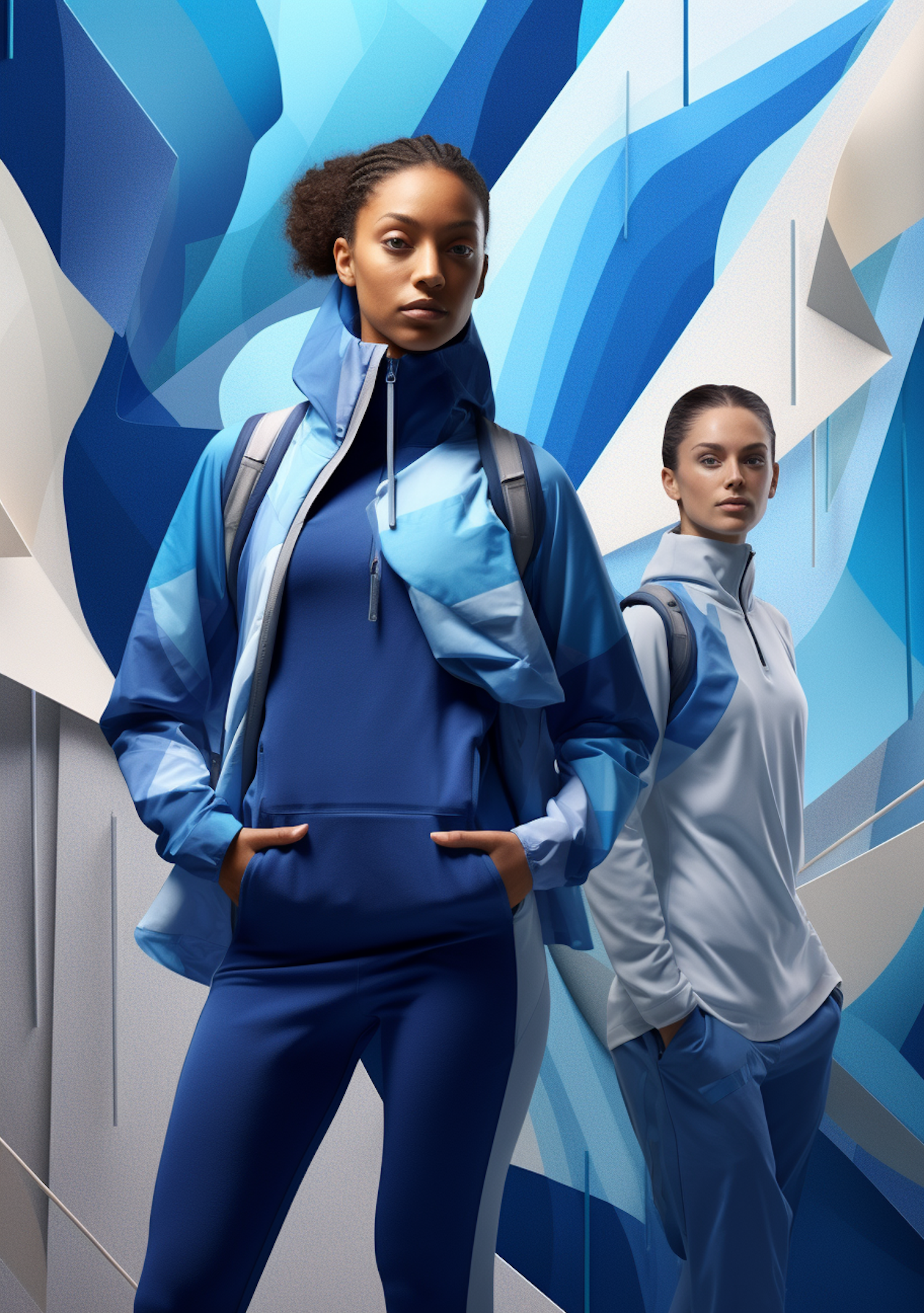 Two women in stylish blue sportswear pose confidently against a dynamic abstract blue background, showcasing modern activewear.