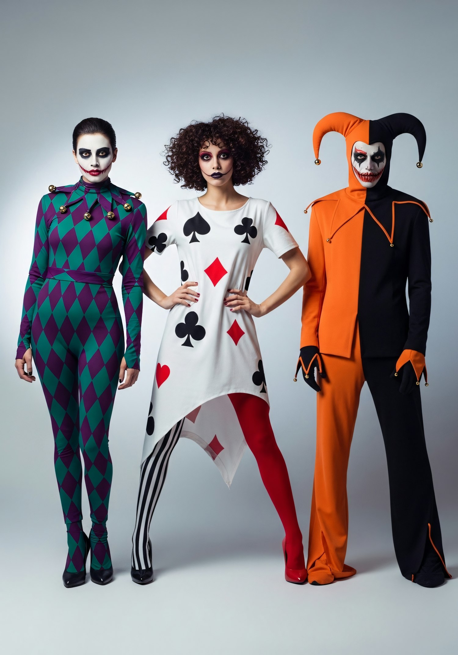 Three individuals in vibrant jester and playing card-themed costumes, featuring bold patterns, face paint, and unique designs.