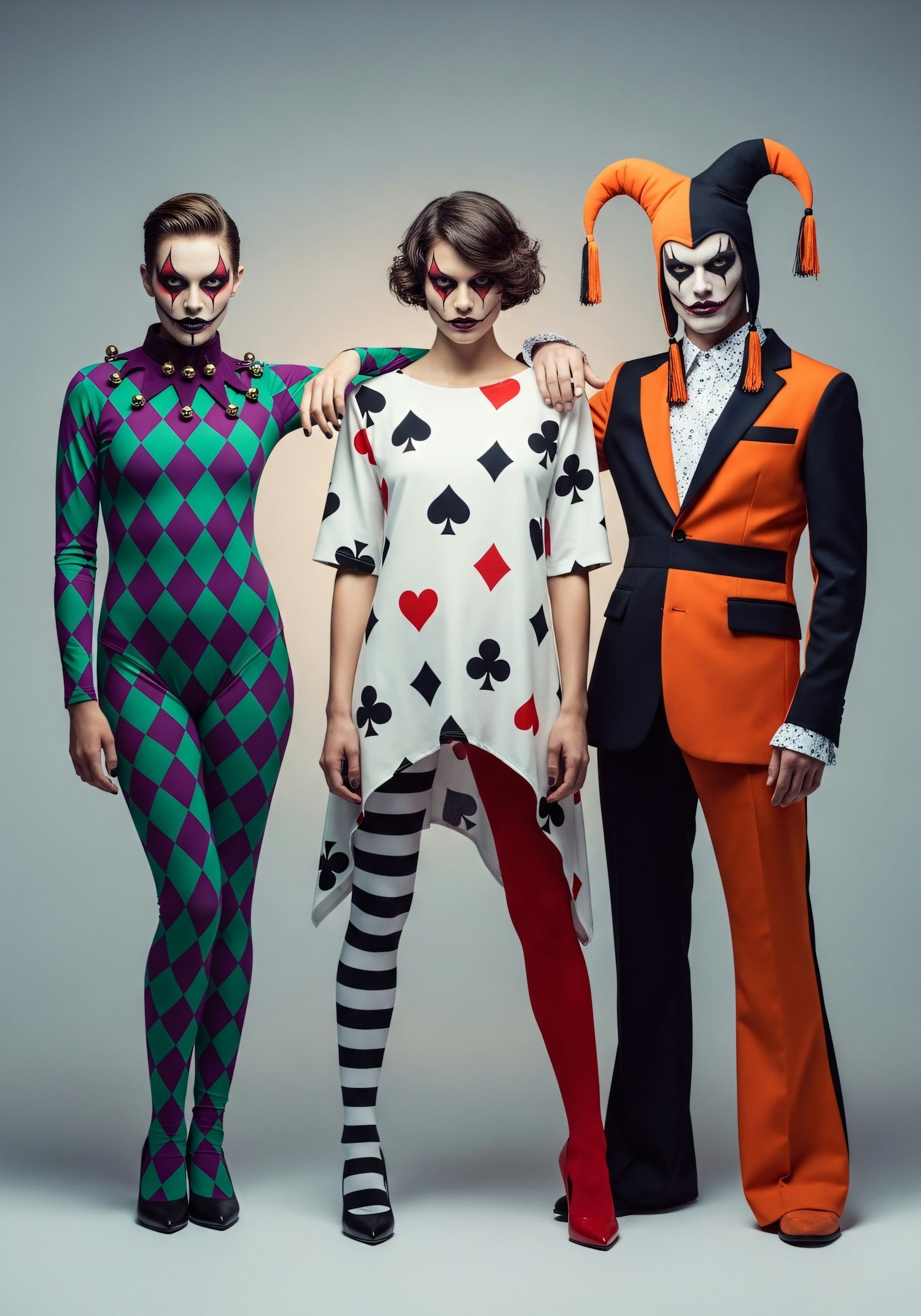 Three individuals in vibrant jester and playing card-themed costumes, featuring bold patterns, dramatic makeup, and theatrical flair.