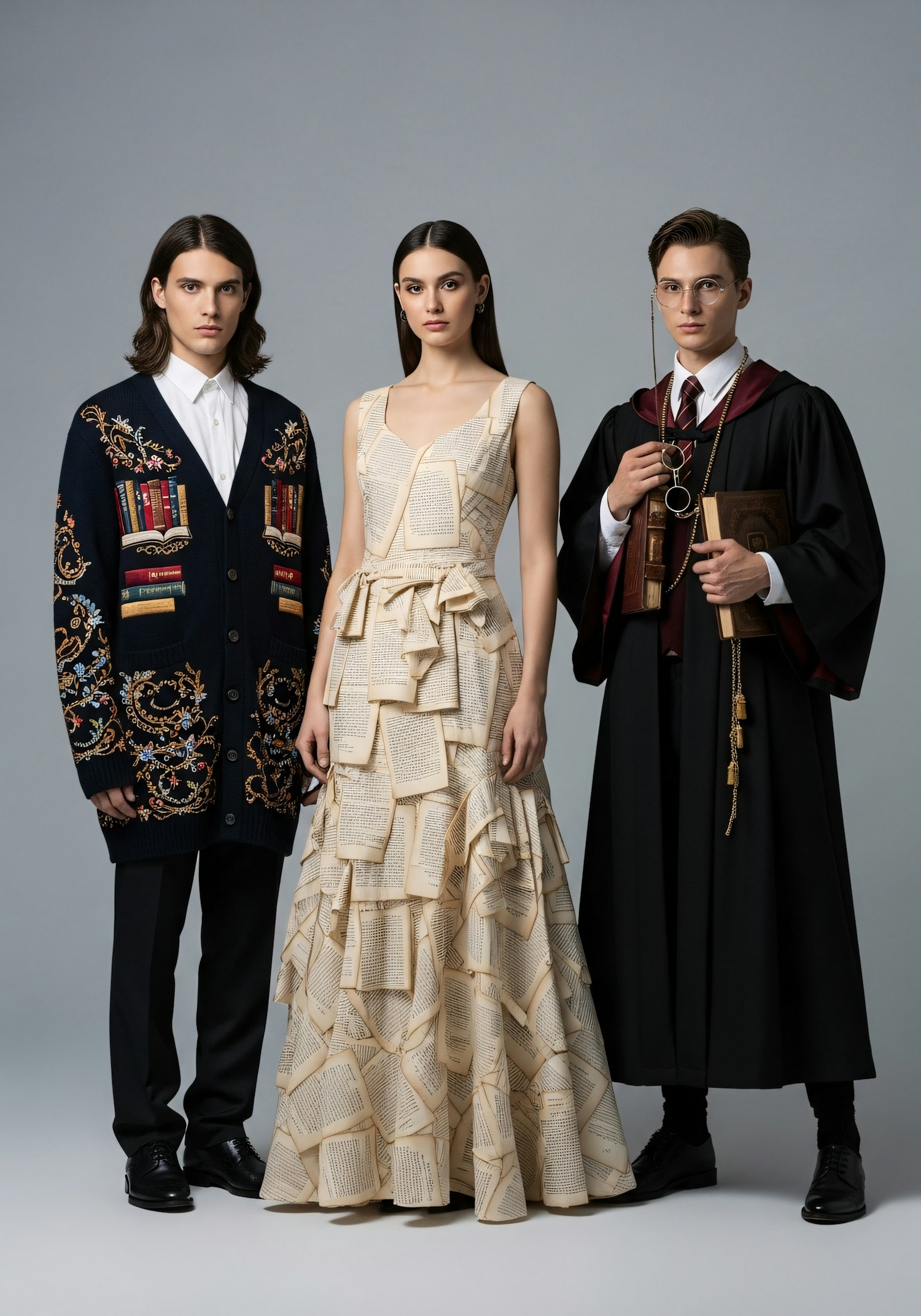 Three individuals in creative, book-themed outfits, including a gown resembling pages and a robe with scholarly accessories.