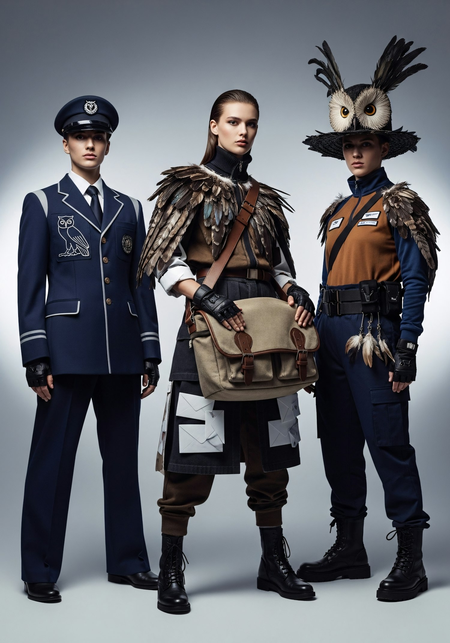 Three individuals in creative, owl-themed uniforms, blending postal and avian motifs with intricate details and unique accessories.
