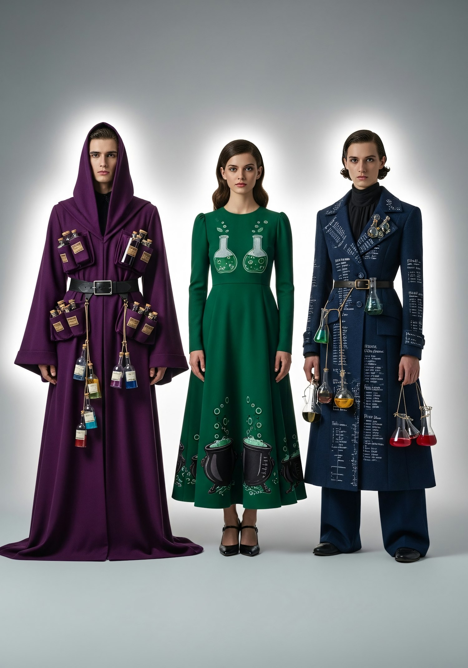 Three individuals in themed outfits inspired by alchemy and science, featuring vibrant colors, potion bottles, and intricate designs.