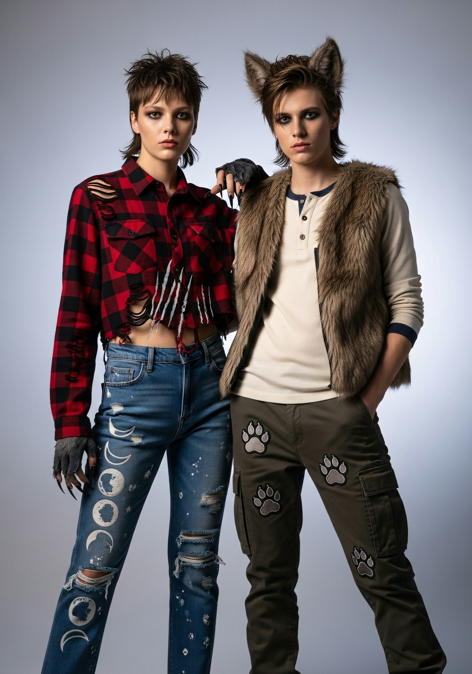 Two individuals in creative, themed outfits featuring distressed details, moon and paw print designs, and wolf-like accessories.