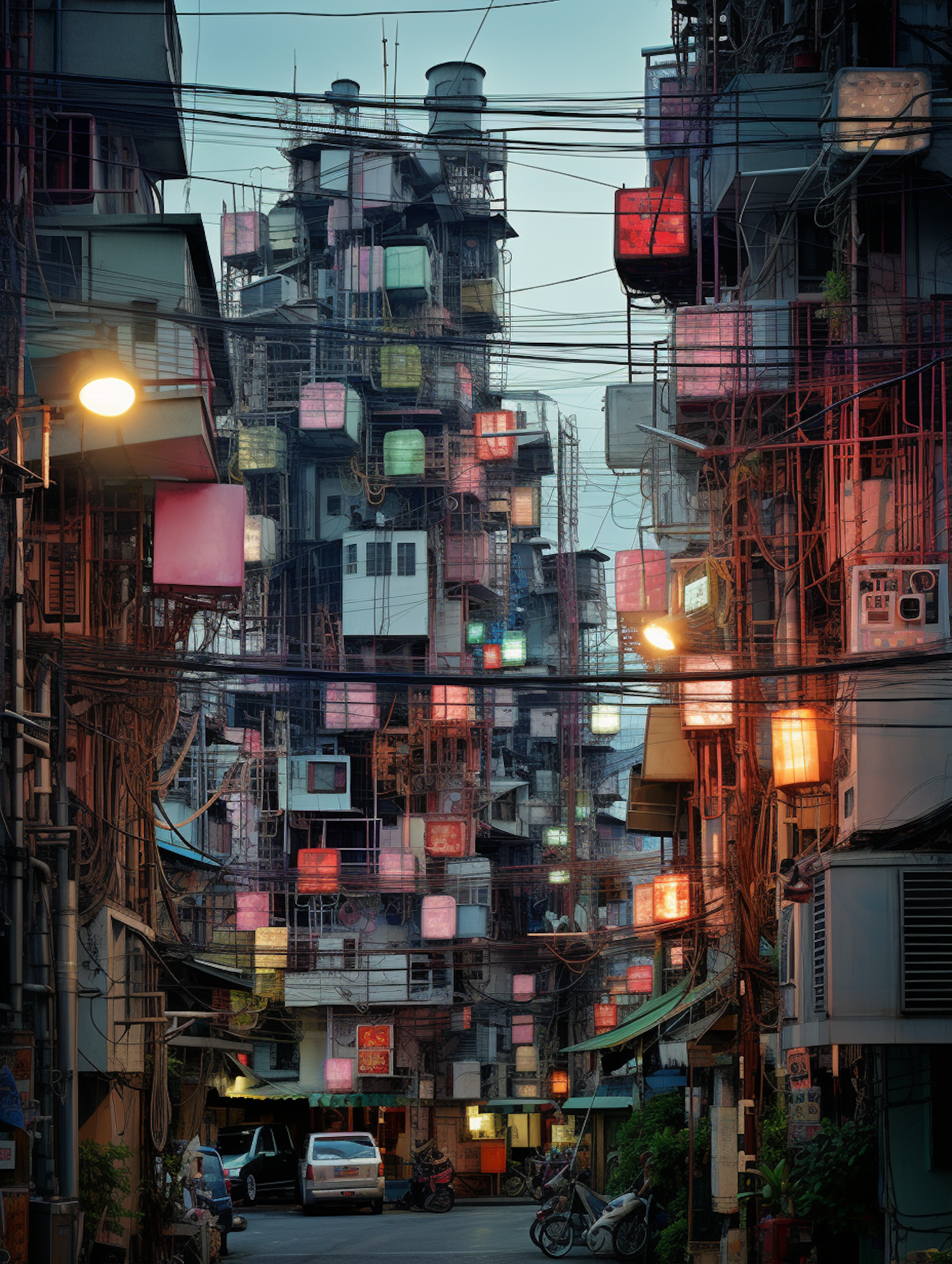 Urban street with glowing cube lights, tangled wires, and towering buildings. A mix of twilight and streetlights creates a vibrant, chaotic vibe.