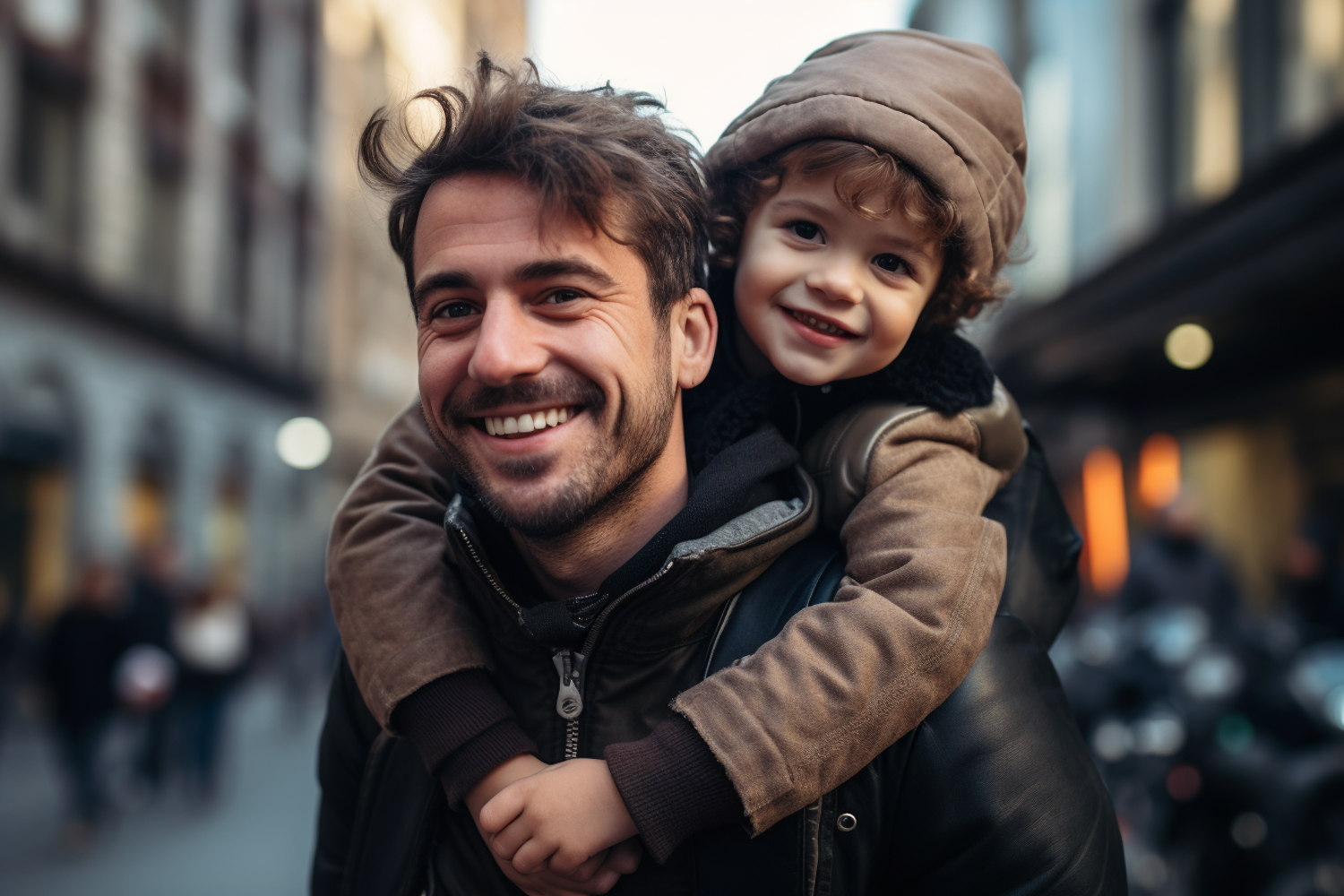 Smiling man with stubble carries a happy child on his back in a bustling city street, both dressed warmly in jackets.