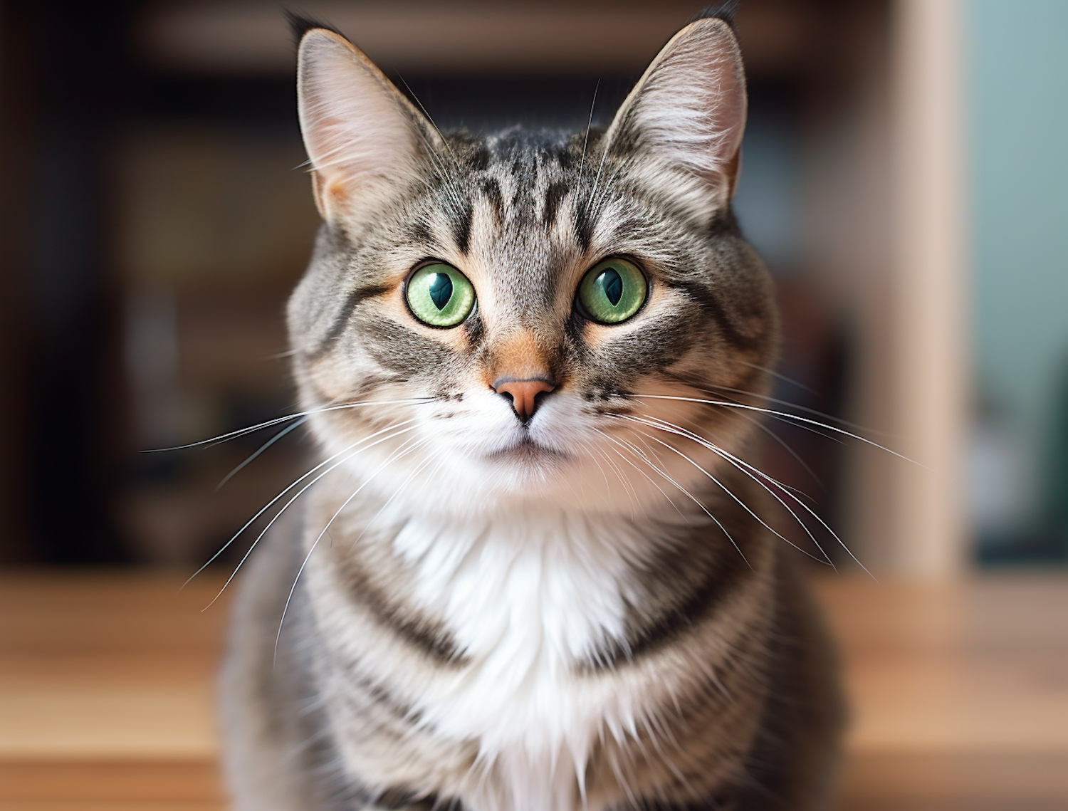 Close-up of a tabby cat with striking green eyes and striped fur, gazing curiously indoors.