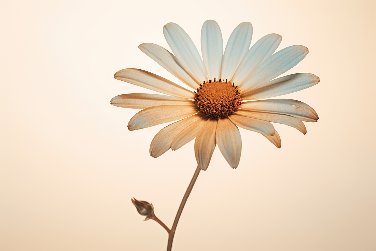 Elegant daisy with white and brown petals against a soft beige background, highlighting its natural beauty and simplicity.