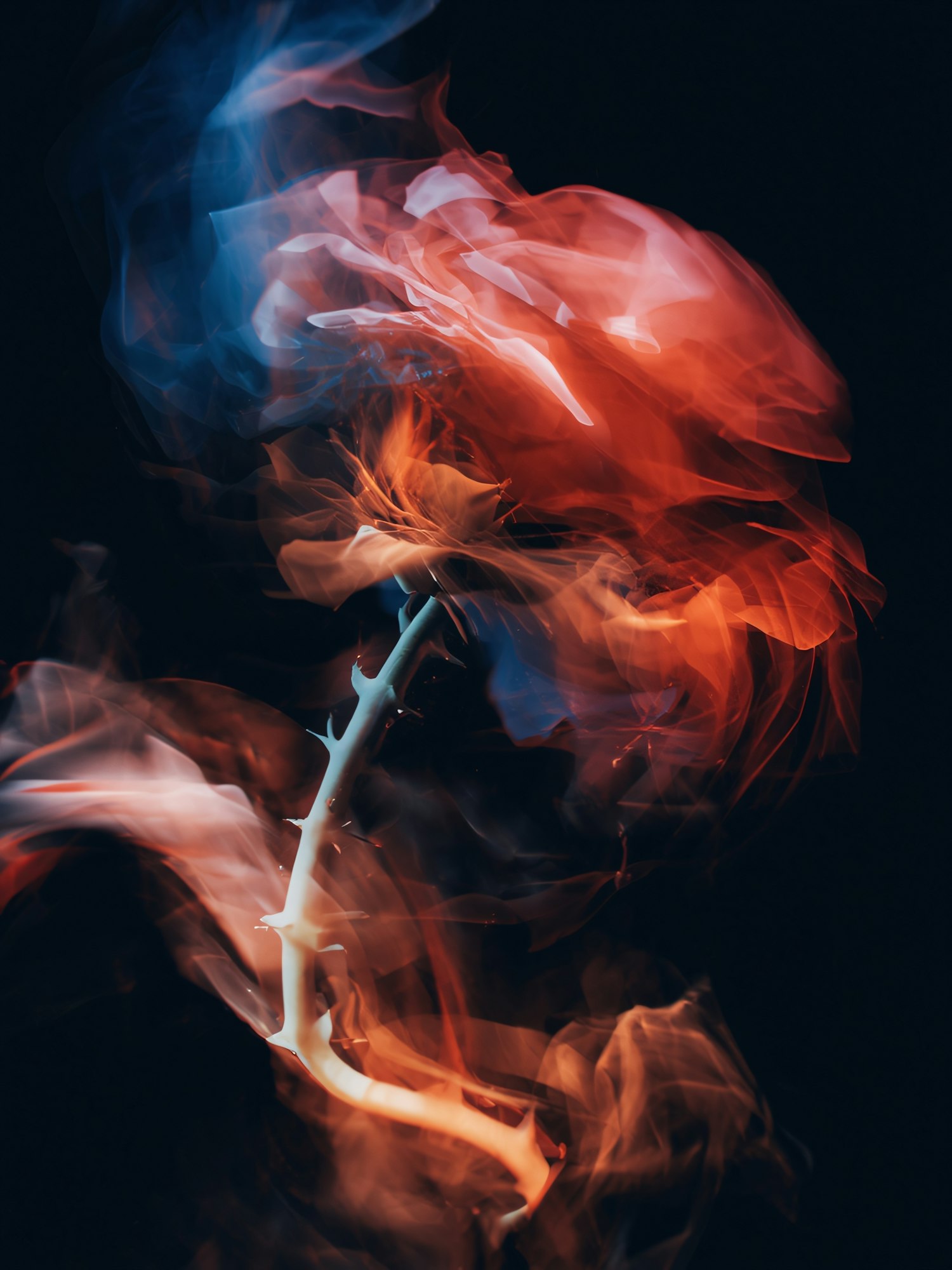 Abstract art with vibrant red, orange, and blue smoke patterns swirling around a thorny stem on a dark background.