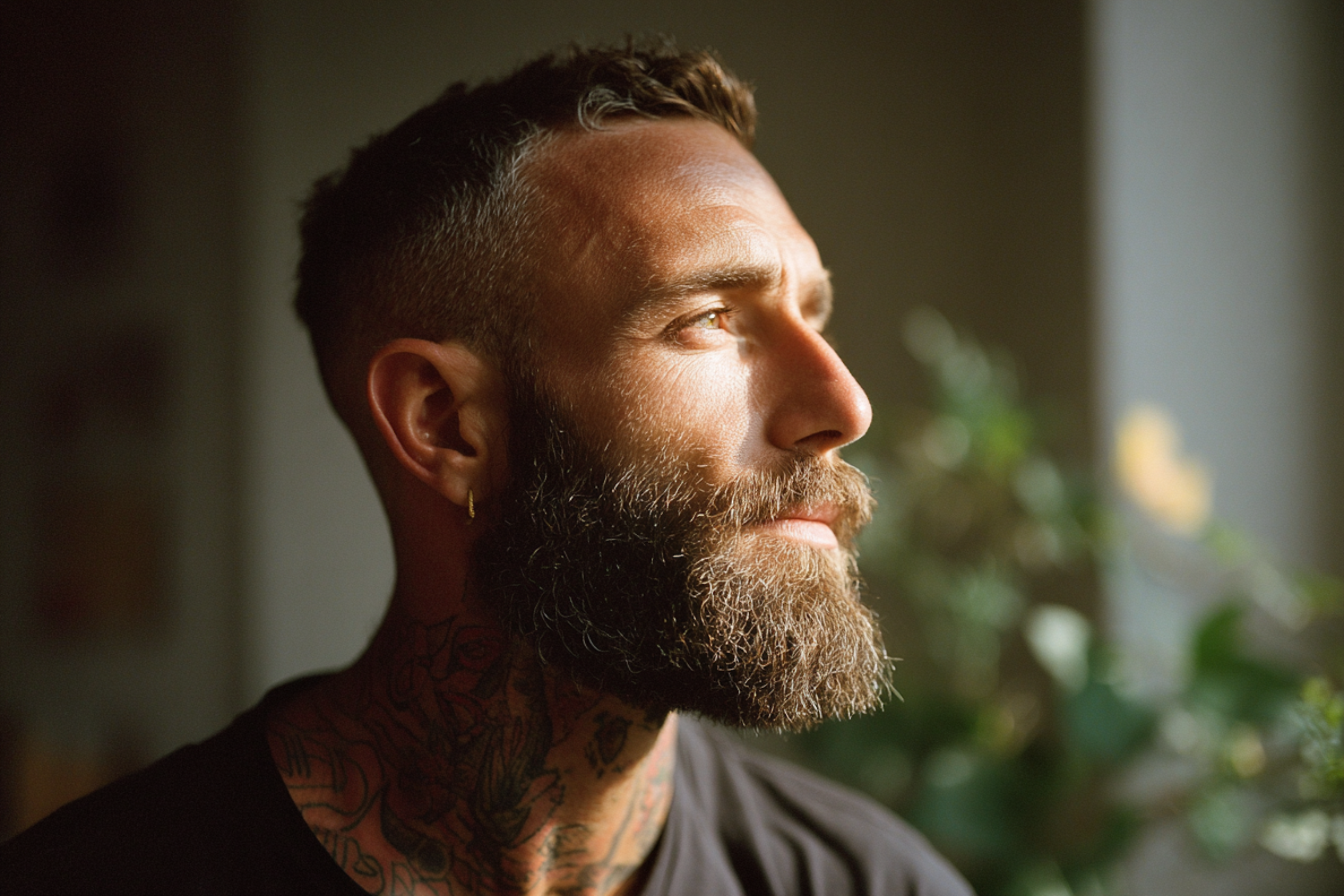 A bearded man with tattoos gazes thoughtfully in warm light, with a blurred background of greenery adding a serene touch.