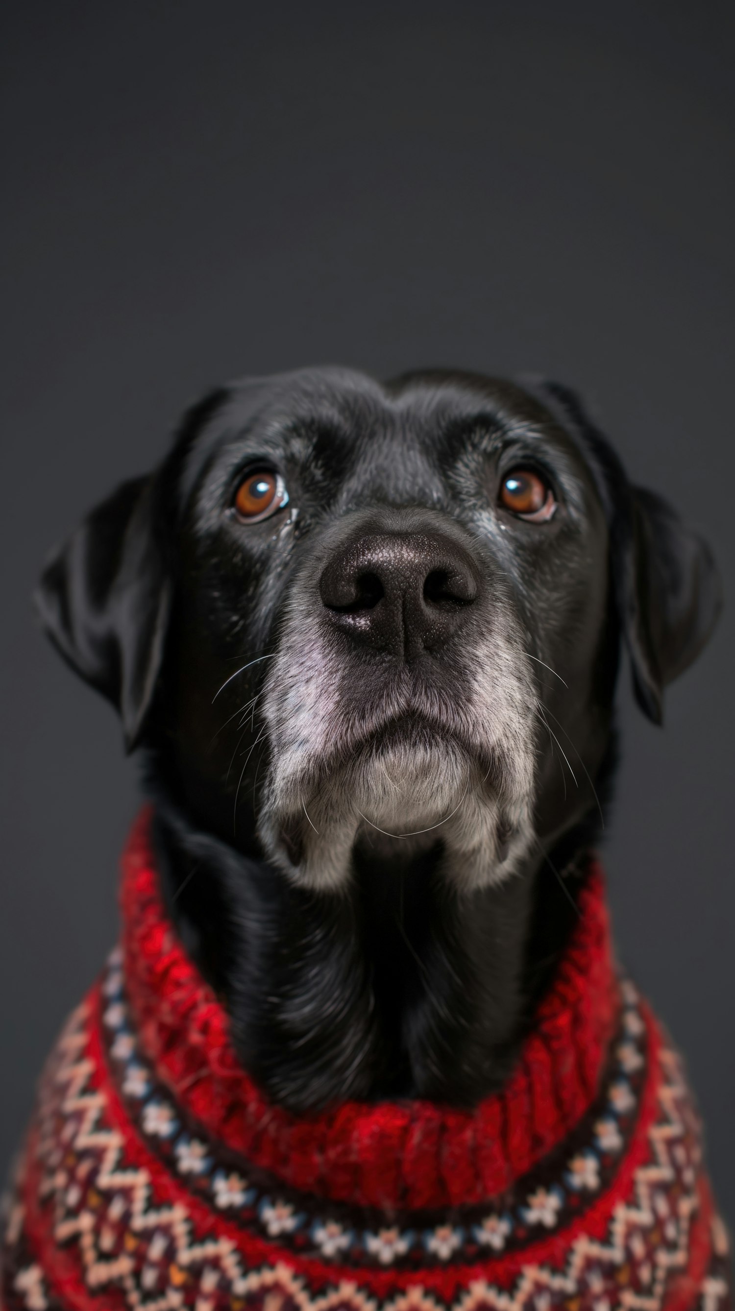 Black Labrador in a festive red sweater with geometric patterns, gazing upward against a dark gray background.