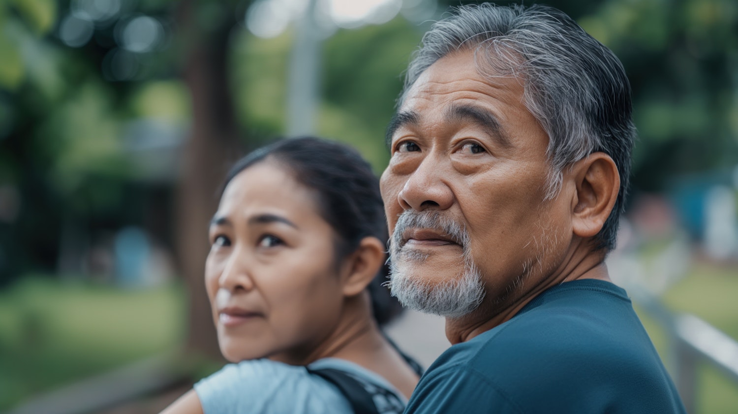 Thoughtful older Asian man and woman in a serene park setting, gazing into the distance with calm expressions.