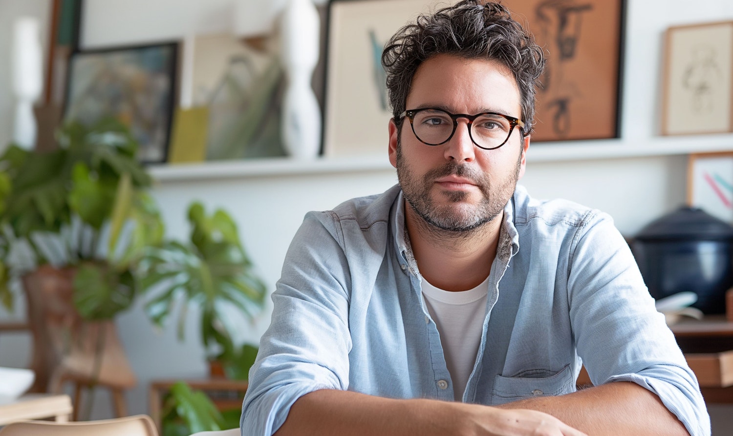Caucasian man with glasses and beard in a light blue shirt, sitting in a creative space with art and plants.