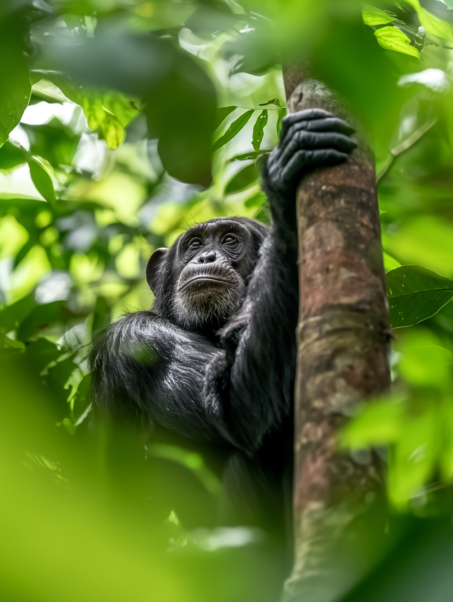 A thoughtful chimpanzee grips a tree in a lush green forest, surrounded by vibrant foliage and dappled sunlight.