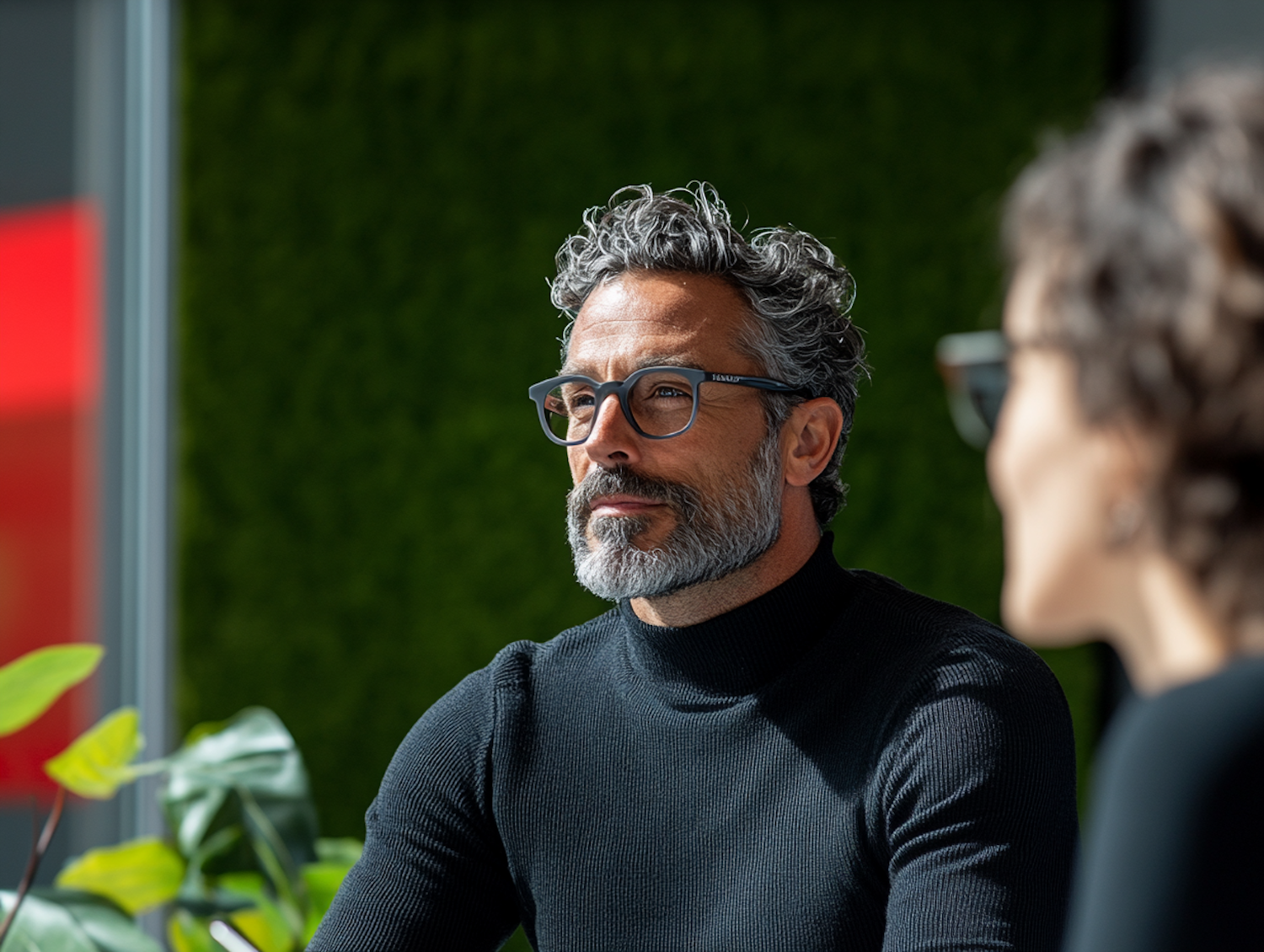 Middle-aged man with glasses and salt-and-pepper beard in a black turtleneck, engaged in conversation, with a green wall background.