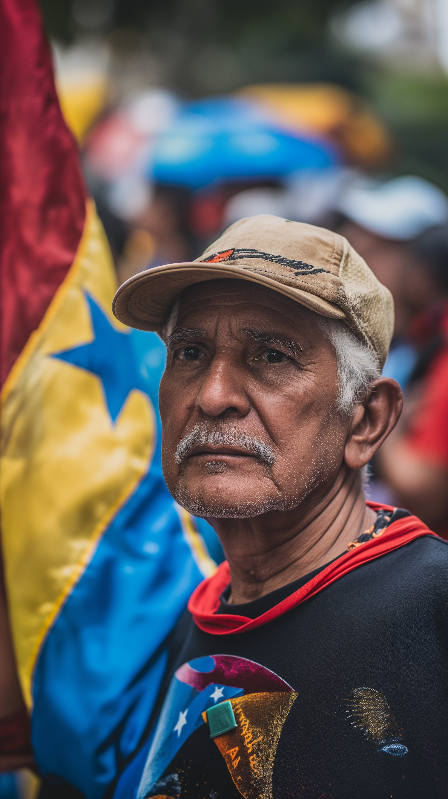 Person with blurred face holds a colorful flag, wearing a cap and graphic shirt, amidst a vibrant crowd scene.
